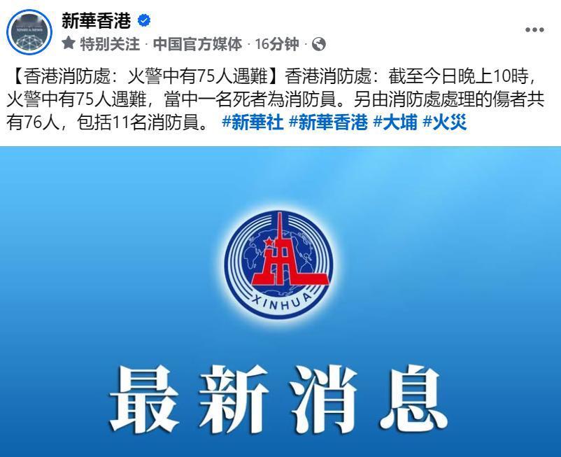 香港消防处:截至今日晚上10时,火警中有75人遇难,当中一名死者为消防员。另由消防处处理的伤者共有76人,包括11名消防员。
