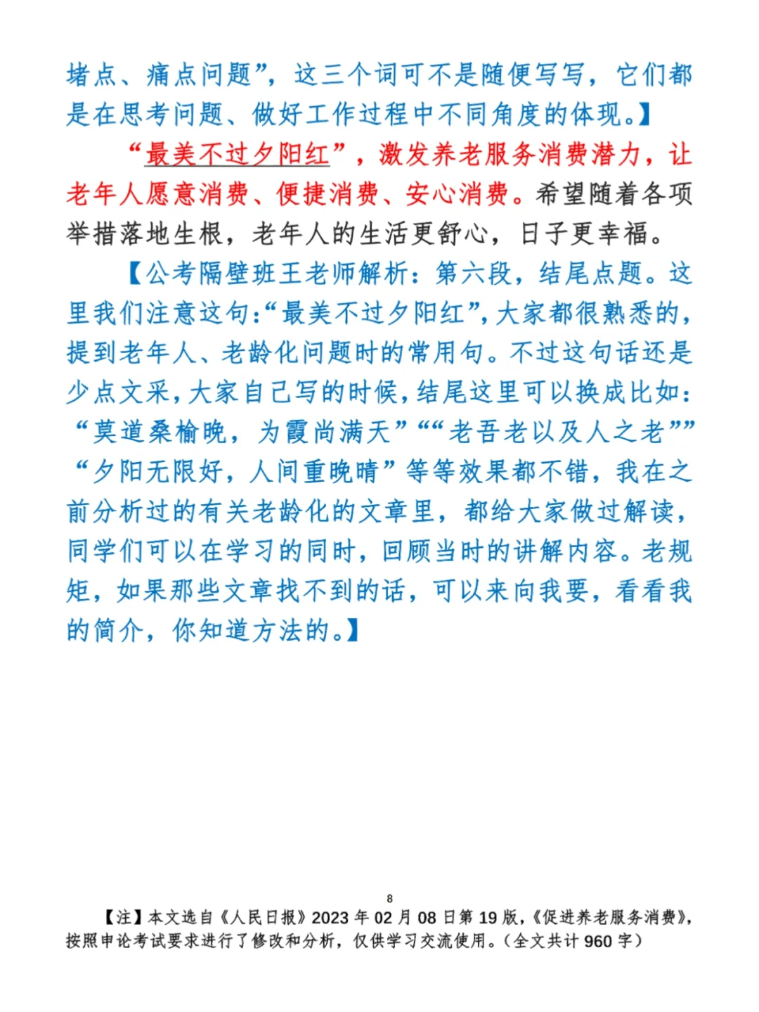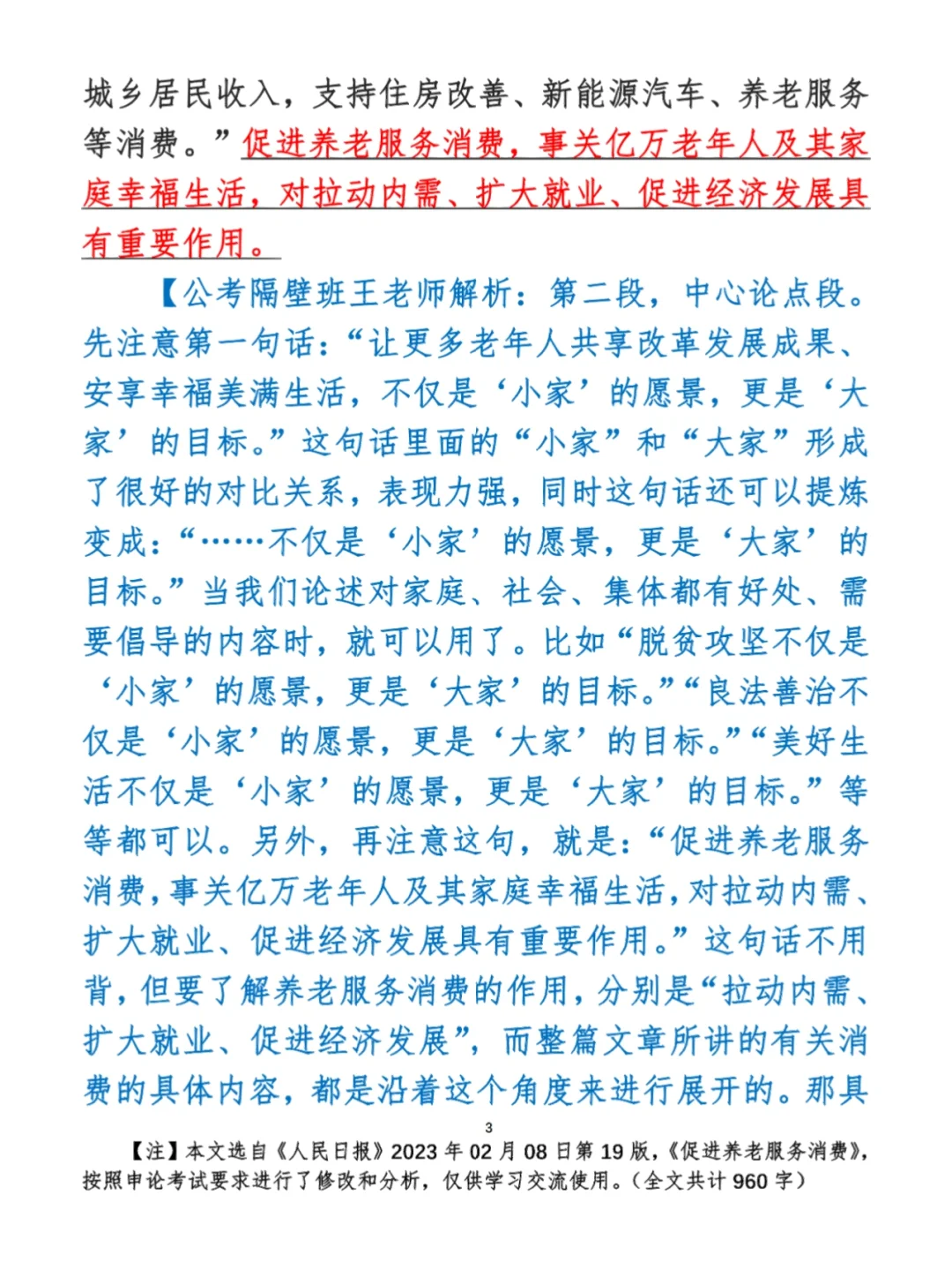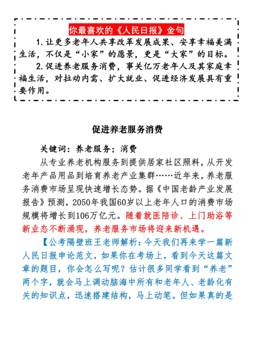 今日打卡作业: 1. 选一句你最喜欢的金句 2. 抄写全文红字+划线部分内容 3. 写完后在留言区打卡 ⭐️ ⭐️ ⭐️ ⭐️ ⭐️ ⭐️ 如何抄写:每天的抄写文章以图片形式发在“公考隔壁班王老师”账号,红色字是重点句和结构句,黑色字是正文,蓝色字是解析,大家抄写时不必抄蓝色字。建议先通读全文(包括蓝色解析部分),做到心中有数再开始抄写,效果会更好。 关于文章:抄写文章来源于人民日报,但每篇文章我都根据申论考试要求进行了修改,主要集中在四个方面:一是重写或修改开头、结尾;二是统一段首句句式结构;三是调整段落字数,使文章结构更均衡;四是简化复杂长难句,使之更具可模仿性。每篇文章修改幅度不同,无论修改多少,都是基于申论考试要求,毫无对人民日报文章品评之意。(此处致敬人民日报) 关于解析:我会在文章每段后面加一段蓝色字的解析,是我自己在抄写时的感悟,篇幅时间有限,不能面面俱到,但求重点突出。如果你有其他感悟,也希望能在评论里分享,我们相互学习、共同进步。 ⭐️ ⭐️ ⭐️ ⭐️ ⭐️ ⭐️ 这里是公考隔壁班王老师独创的“每天半小时・申论80分”抄写团,欢迎加入我们!