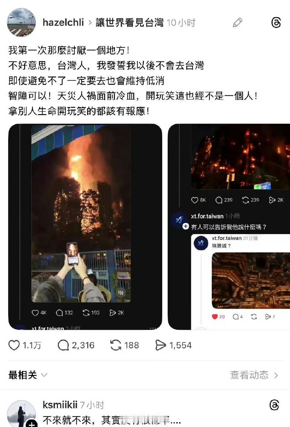 台湾青鸟太冷血了,竟然嘲讽香港火灾是在模仿“台北101放烟花”。 好家伙,开玩笑也要分场合,作为同种同族的中国人,在灾难面前,本该携手同行,谁料这些青鸟竟然隔岸观火,落井下石,简直冷血到极致。 香港网友也是气愤不已,如果台湾人都是如此面目,发誓以后再也不会去台湾。 岛上的这些青鸟已经被严重洗脑,它们都不知道自己是什么,整天出征这个出征那个,完全沦为赖桑的走狗打手,回归后全部发配沙漠去植树!