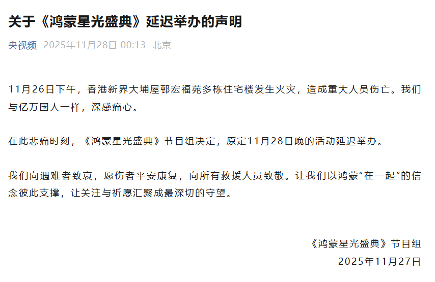 香港大火的原因,华为和CCTV推迟了11月28日的“鸿蒙星光盛典”。