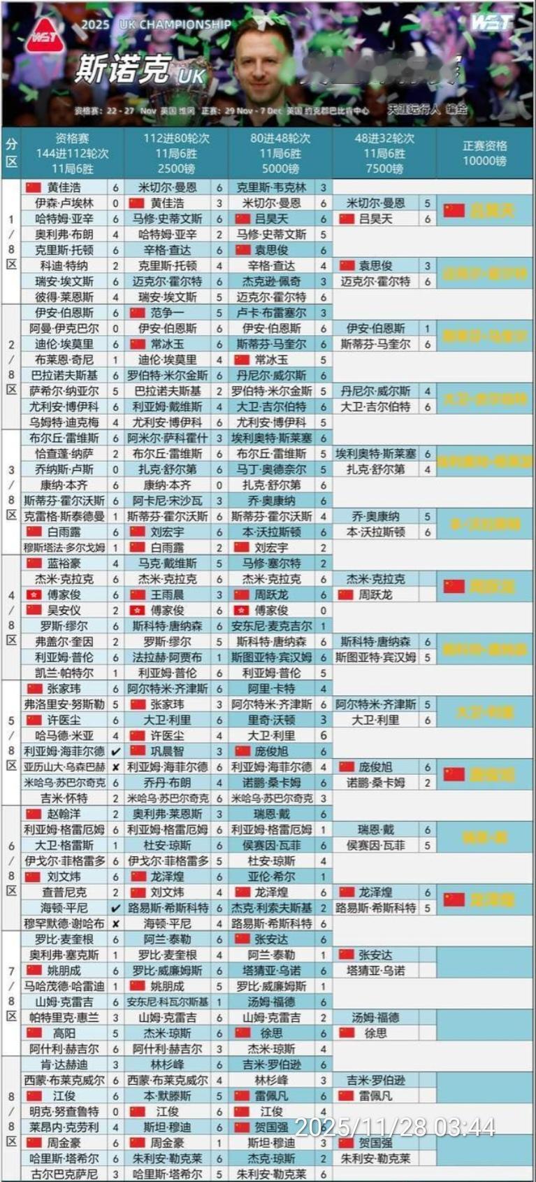 2025斯诺克英锦赛正赛再添3名中国名将(正赛确定有10名中国球员,还有3名正在比赛中):庞俊旭、龙泽煌、张安达。国强4-6遗憾出局,雷佩凡5-5扳平进入决胜局,徐思4-3暂时领先。 庞俊旭6-2桑坎姆 龙泽煌6-5西斯科特(小龙3连鞭赢得惊险) 张安达6-4塔猜亚