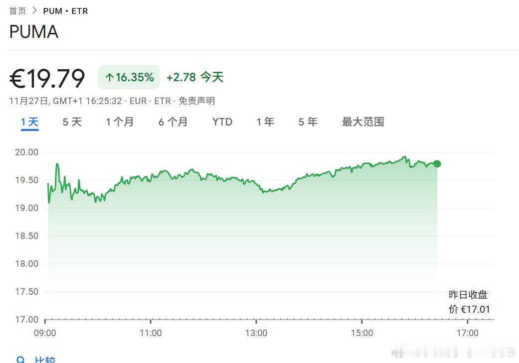 【彪马跳涨19%彪马股价暴涨】当地时间11月27日,随着美国市场因感恩节休市,欧洲股市成交量明显低于30日均值。欧洲斯托克600指数收盘上涨0.1%。彪马跳涨19%,创二十多年来最大涨幅。(财联社)