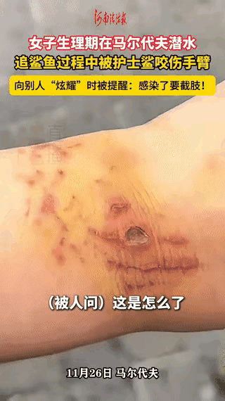 一名女潜水爱好者在生理期去马尔代夫潜水,专门追着护士鲨拍照。水下被鲨鱼咬伤手臂后,她上岸只简单处理伤口,还跟朋友炫耀是被鲨鱼咬的。朋友提醒伤口感染可能需要截肢,她一直没当回事,觉得回去就会好。 网友看了视频说她太大胆,伤口接触海水容易感染海洋细菌。护士鲨一般不攻击人,但生理期血液可能刺激鲨鱼。这种细菌感染速度快,严重的会危及生命。 现在大家就等着看后续发展了。