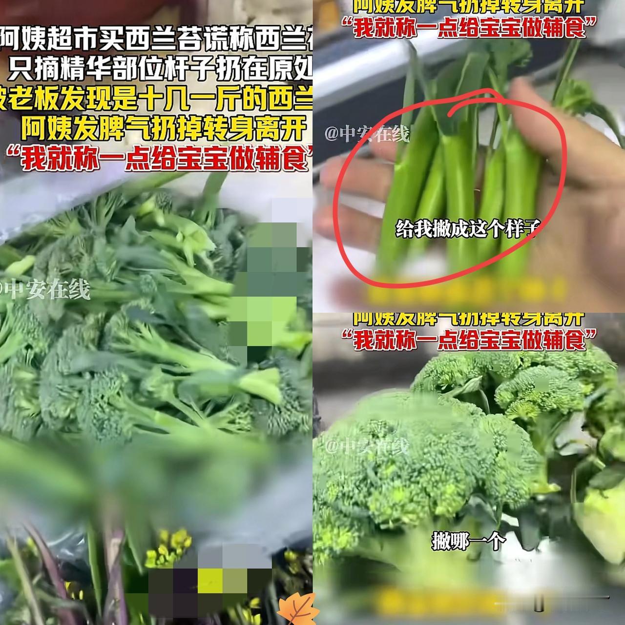 湖北武汉,一大妈去超市买菜,拿着贵价西兰苔,趁人不注意把嫩花花全掰掉,只留光秃秃