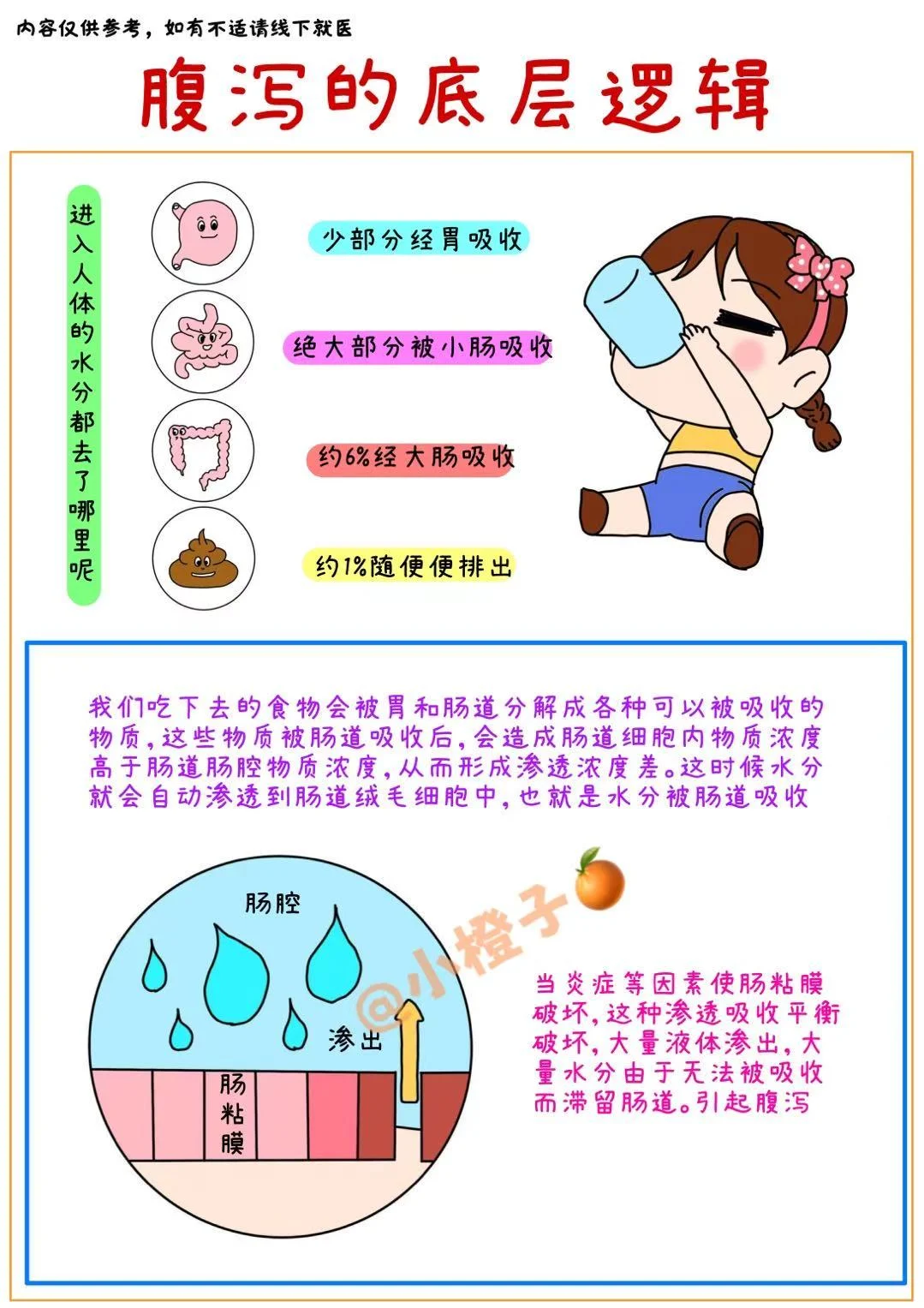 ⭐️腹泻的底层逻辑是什么呢❓我们摄入的水分被不同的器官吸收,其中绝大部分被小肠吸收,而肠道对水分的吸收就是一个被动的渗透吸收原理,然而当一些因素导致这种渗透吸收平衡被破坏时,大量水分由于无法被吸收而滞留肠道,就会导致腹泻的发生。
