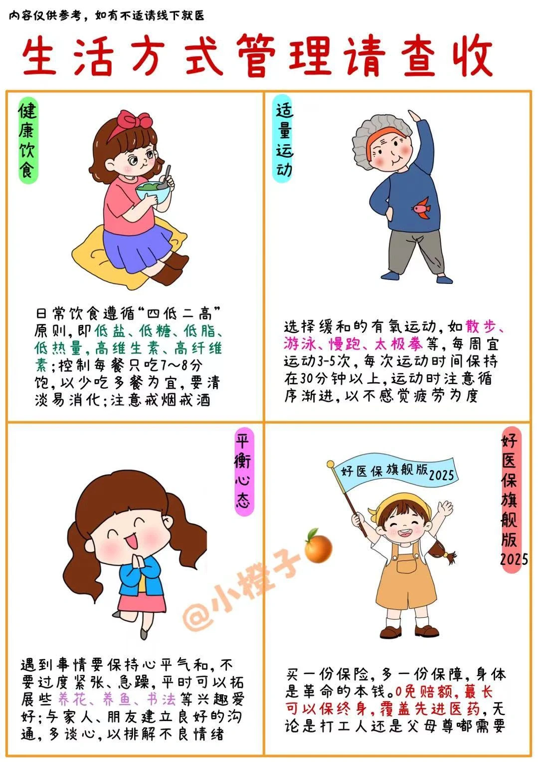 当然生活方式管理不能忘,健康饮食、适量的运动,保持良好的心态是必不可少的!