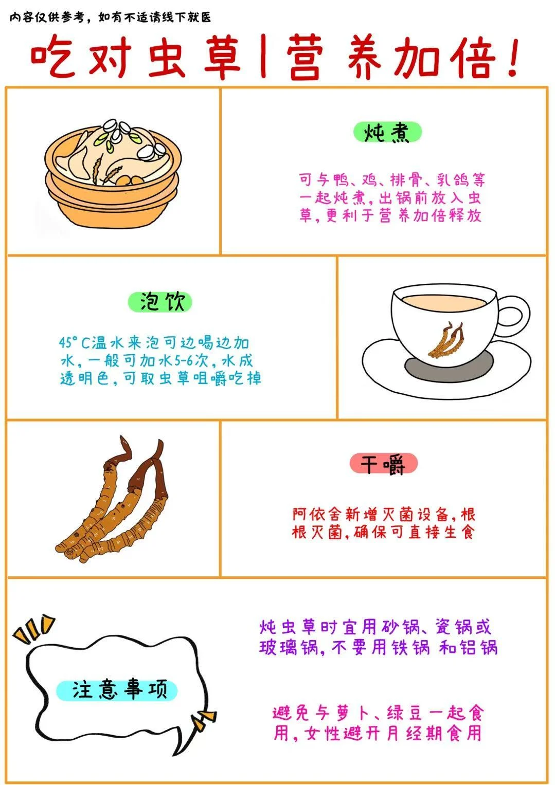 如果要炖汤的话要注意:炖虫草时宜用砂锅、瓷锅或玻璃锅,避免与萝卜、绿豆一起食用