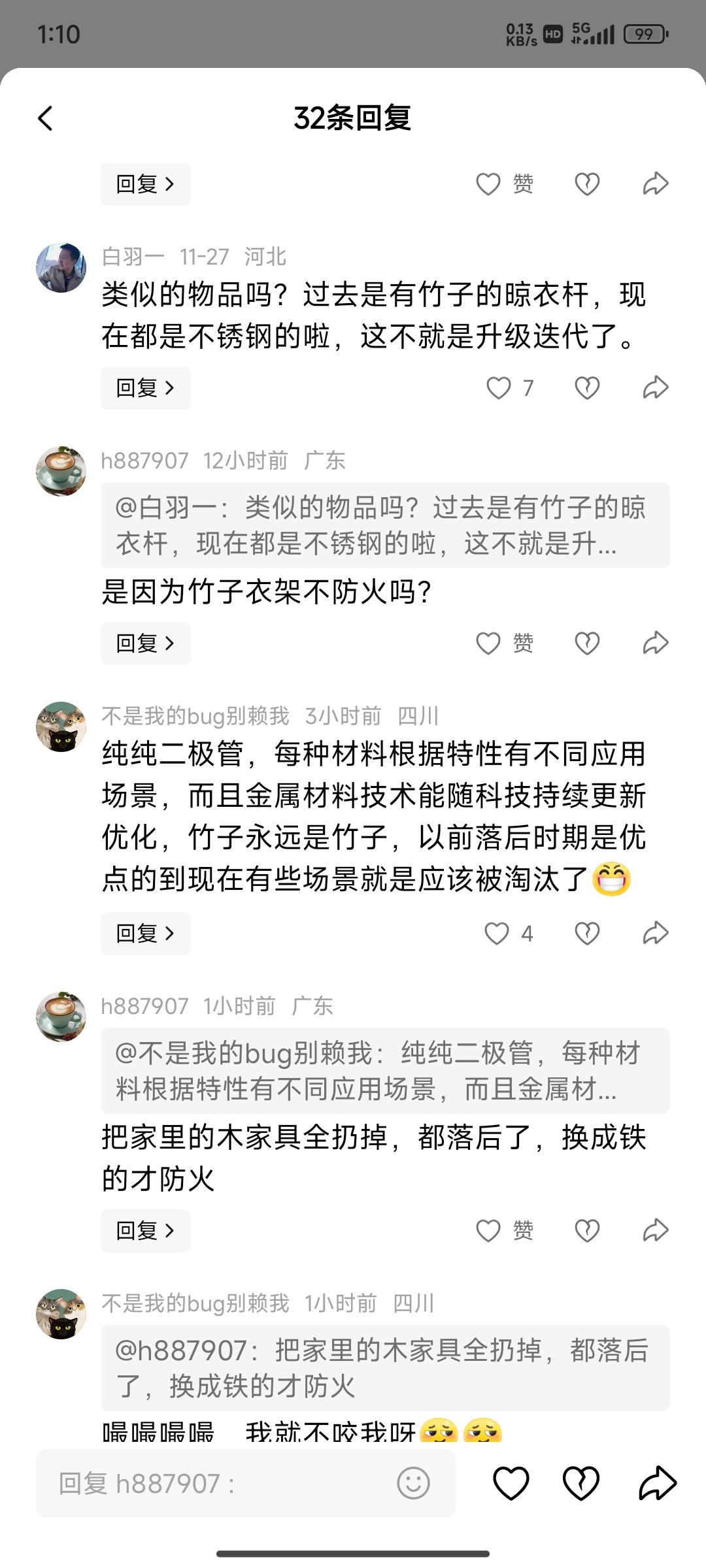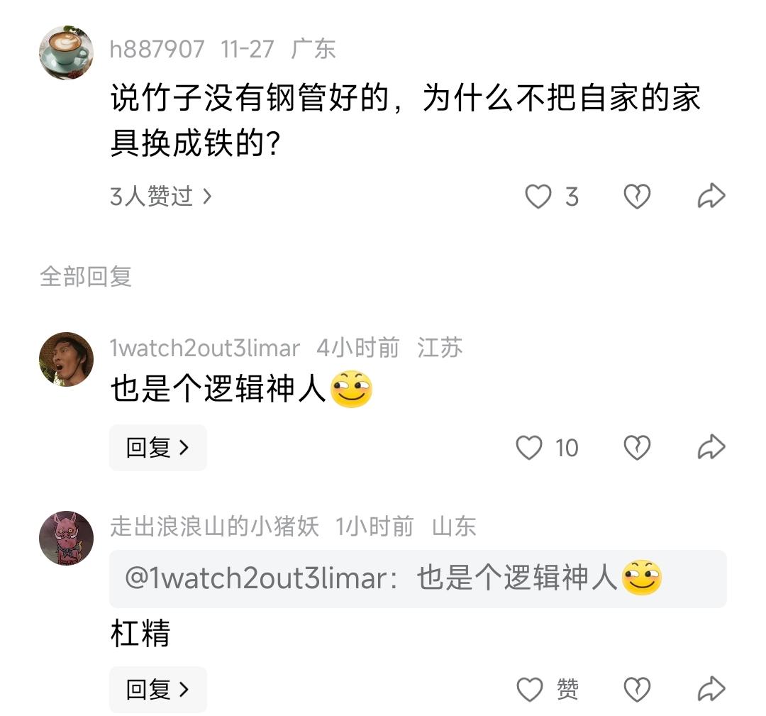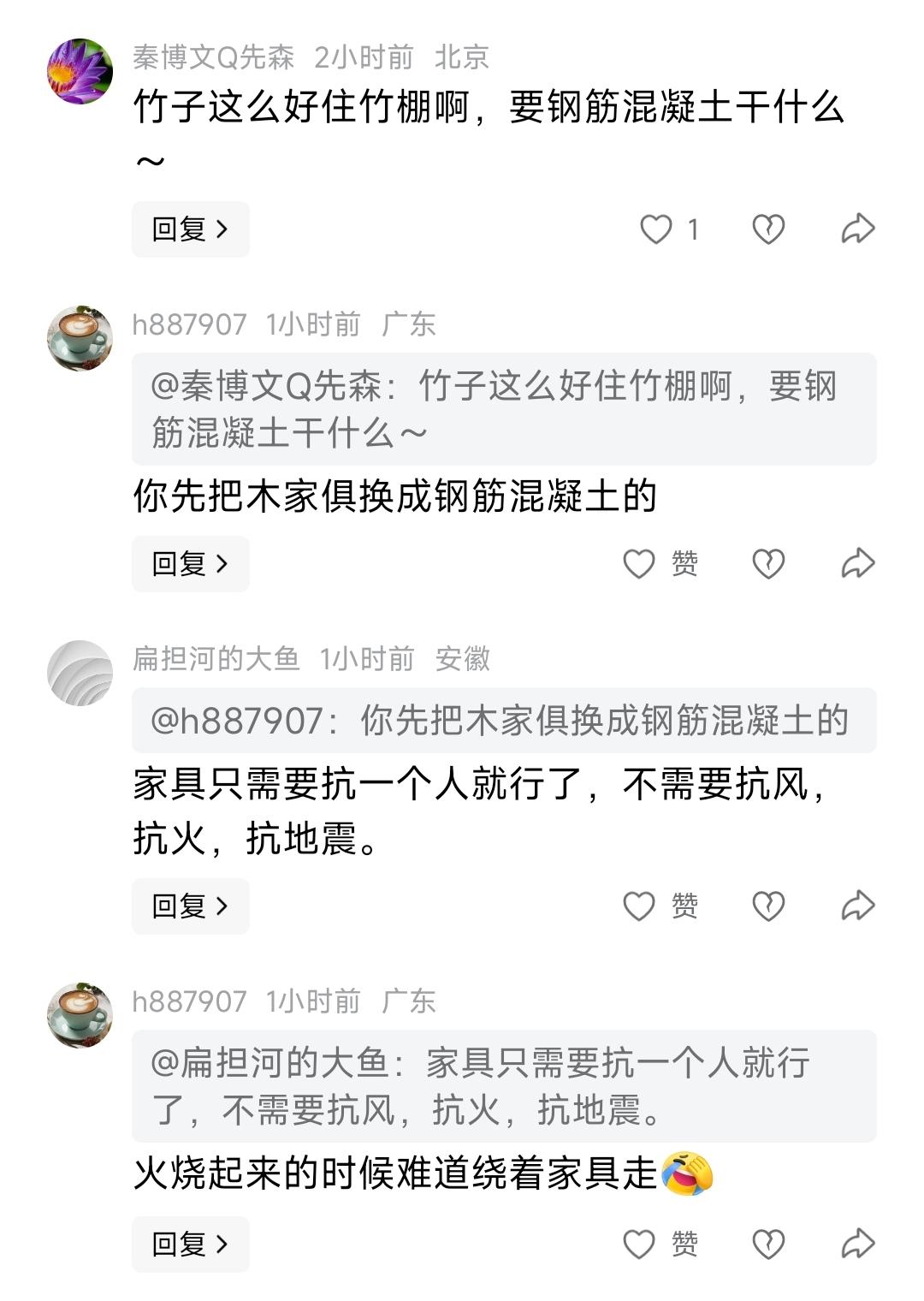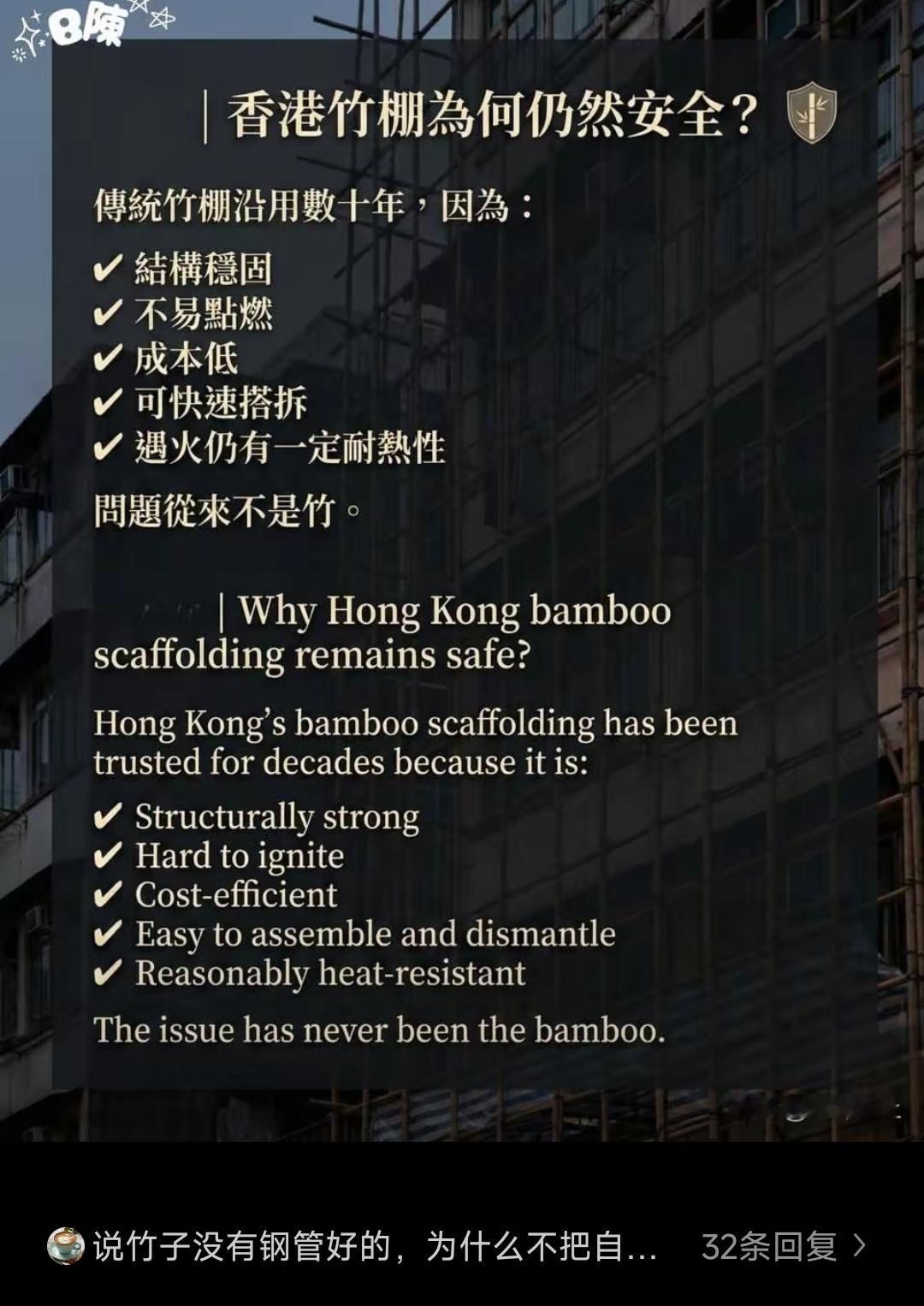 这就开始科普竹子脚手架的阻燃性了啊,还各种论述立秋证明竹子比钢管的优势。我能想到的就是竹子便宜,几层的自建房体量小,用竹子合算。这种几十层的场景,还要力证竹子比钢管适合?难道为了证明自己比大陆优越,完全把物理现实丢一边了啊。
