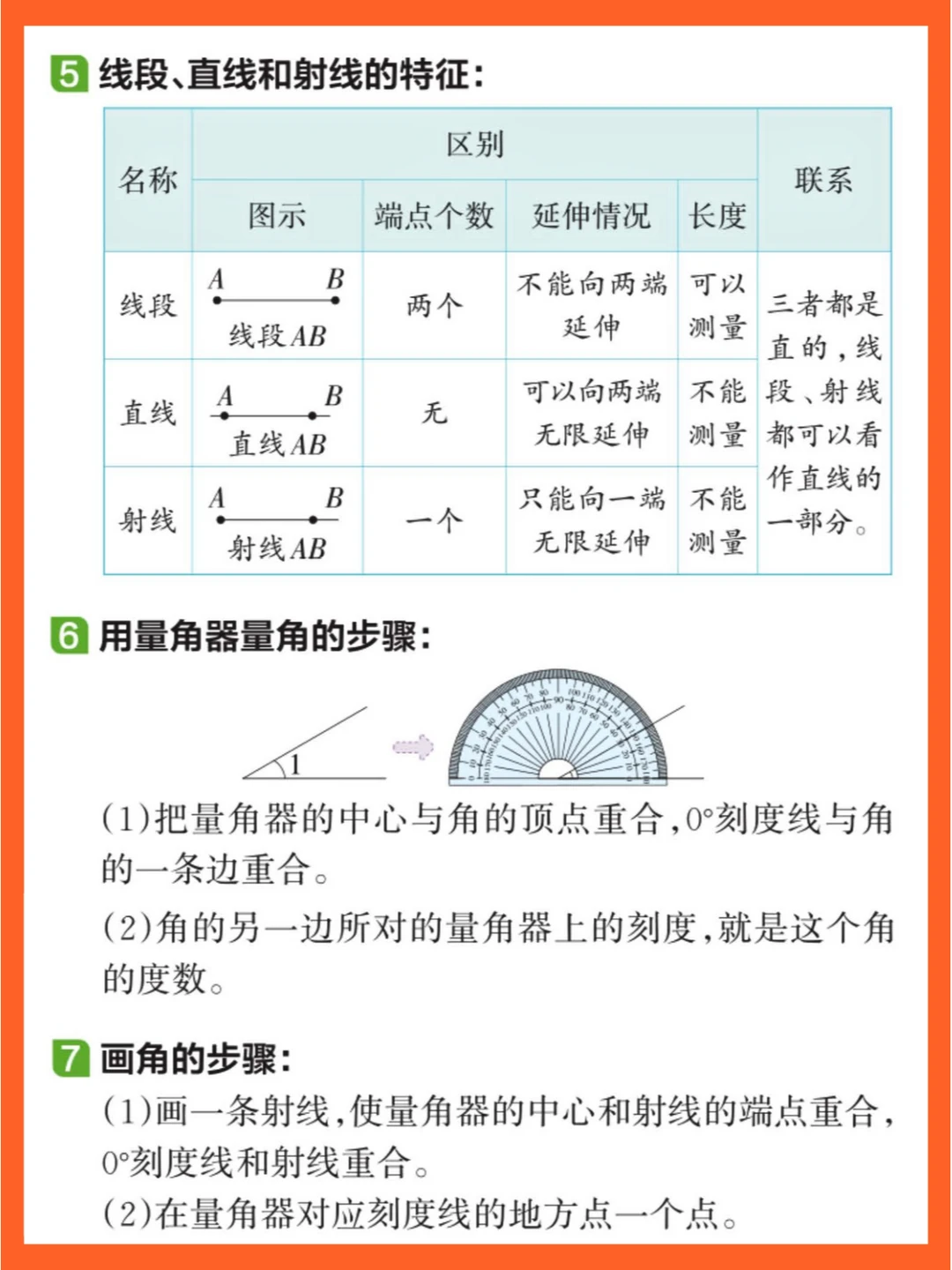 第3️⃣单元《角的度量》:认识射线、直线、角,学会用量角器量角和画角,还包括角的分类(锐角、直角、钝角、平角、周角)以及角之间的关系。