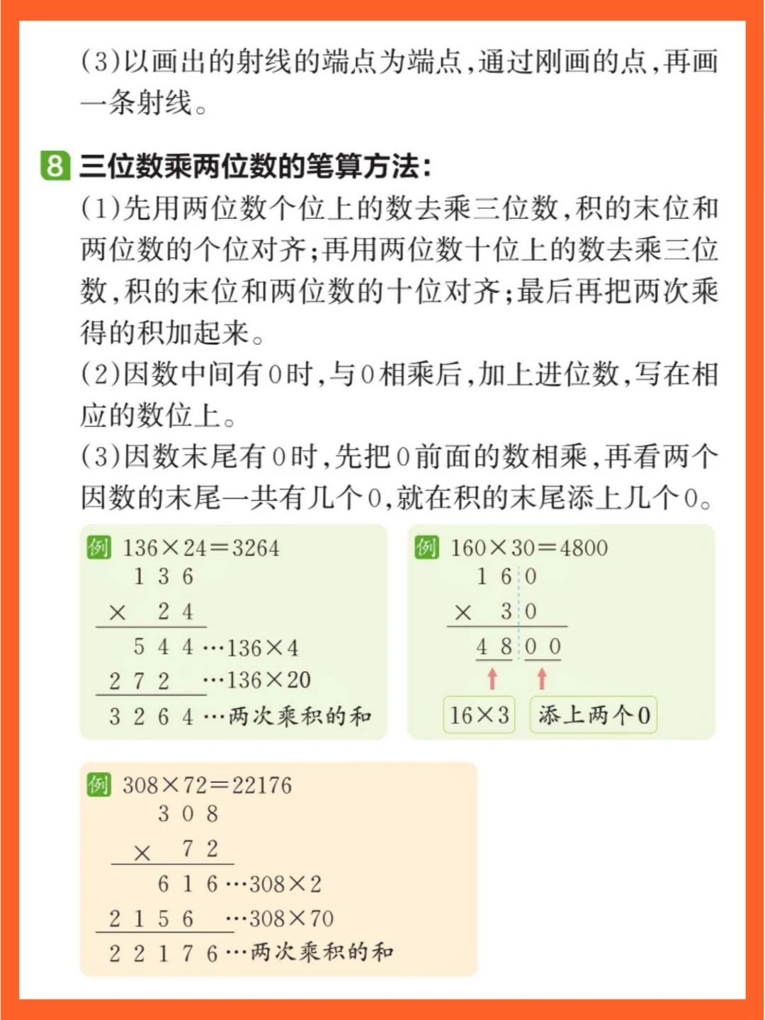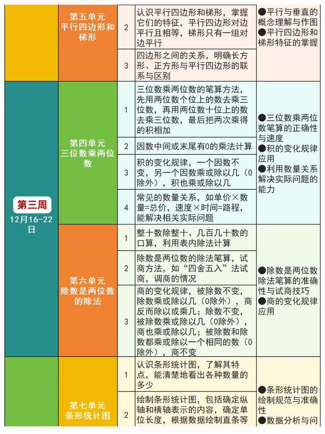 第4️⃣单元《三位数乘两位数》:涉及乘法的笔算方法、因数中间或末尾有 0 的乘法,以及积的变化规律和常见的数量关系(单价 × 数量 = 总价、速度 × 时间 = 路程)。