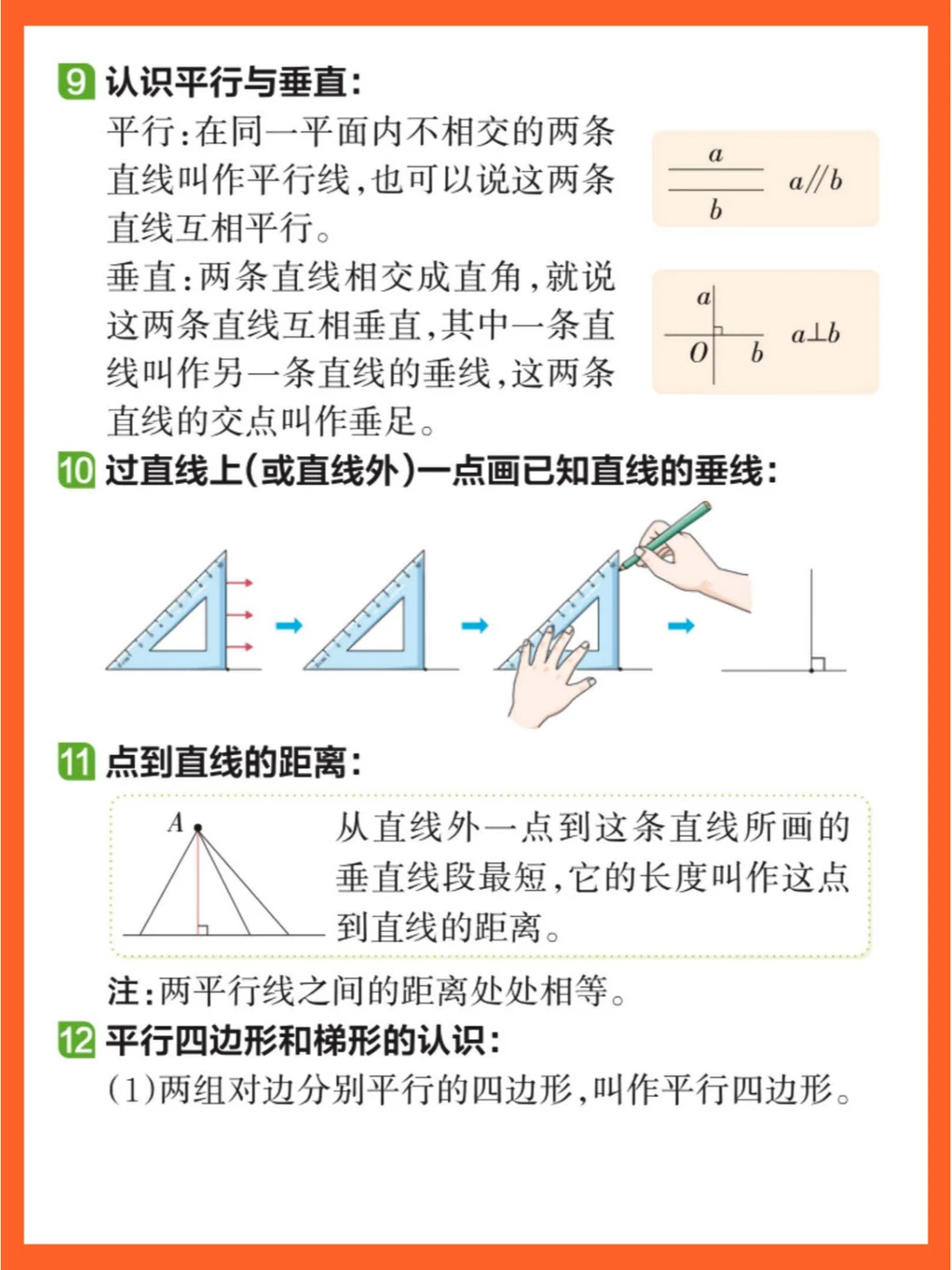 第5️⃣单元《平行四边形和梯形》:包括平行与垂直的概念、画垂线和平行线,以及平行四边形和梯形的特征、四边形之间的关系。