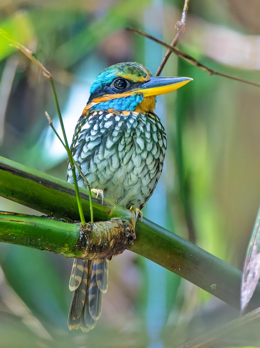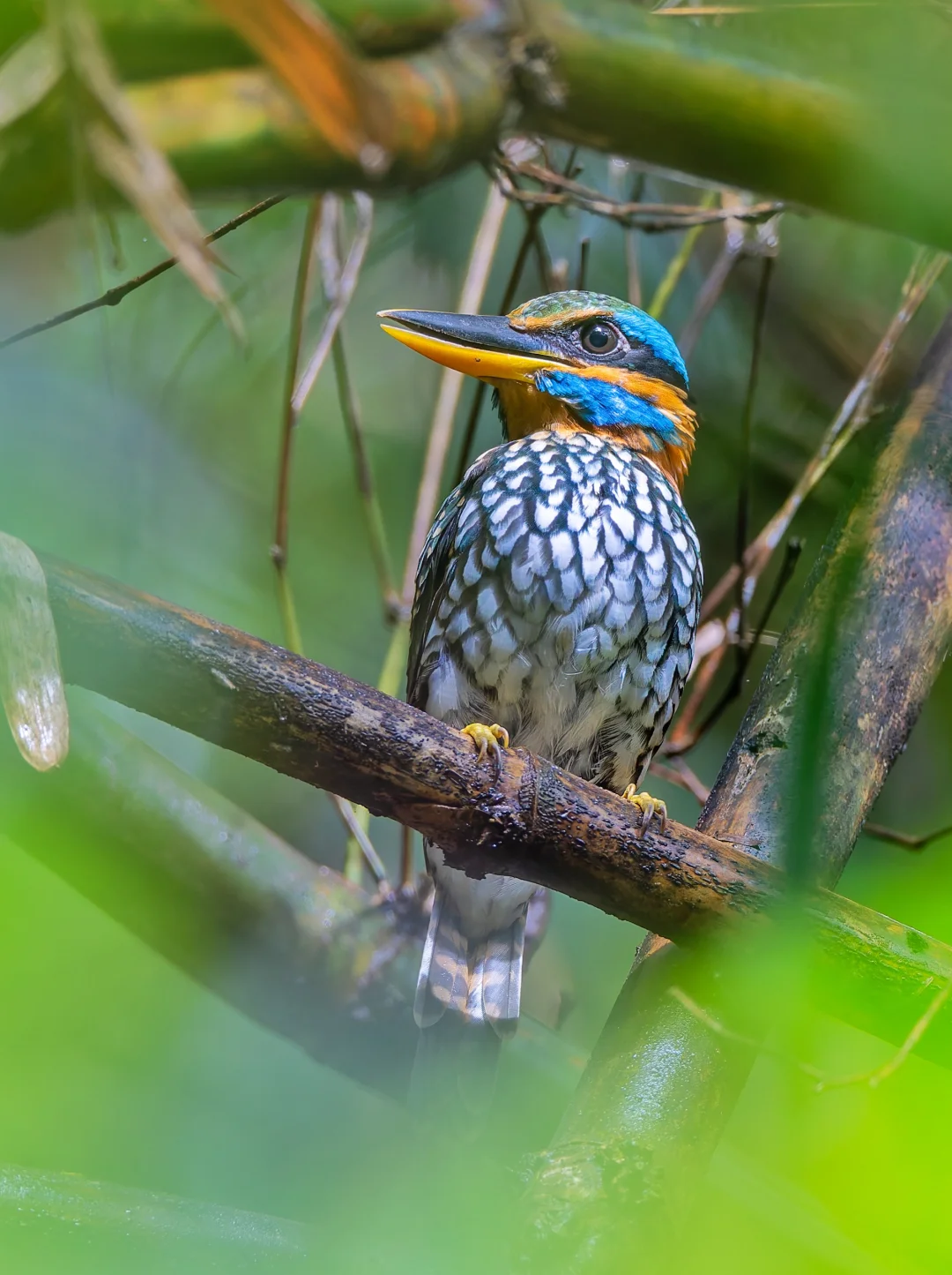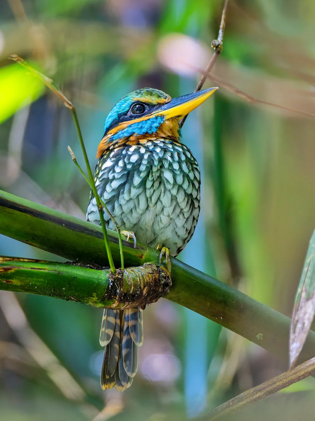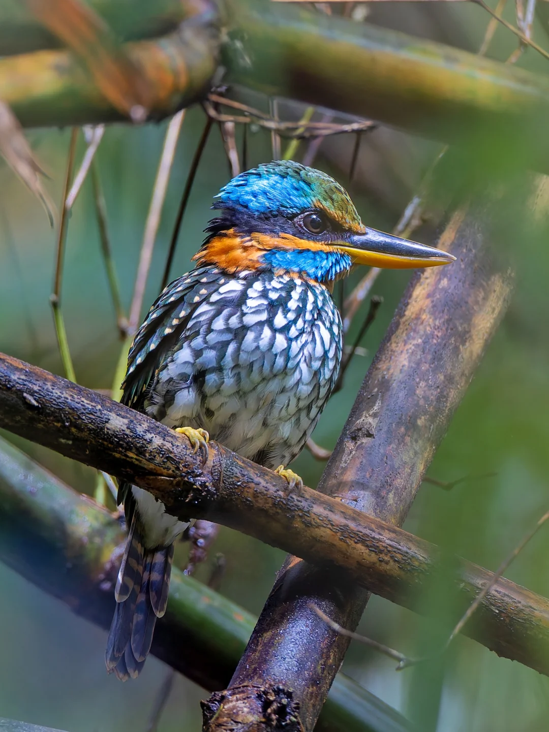 今年3月份在菲律宾一直想找这种漂亮的翠鸟,听到很多次声音还很近,结果后来都没有找到,实在是太怨念了。10月份再次憧憬rizal,竟然又在身边听到了这种响亮吵闹的声音,我的视力简直是开了光,在鸟导都没有找到的情况下,居然发现了他在丛丛阴暗茂密的竹林里。而且还真的就一动不动近距离任我们爽拍,实在是太棒了。