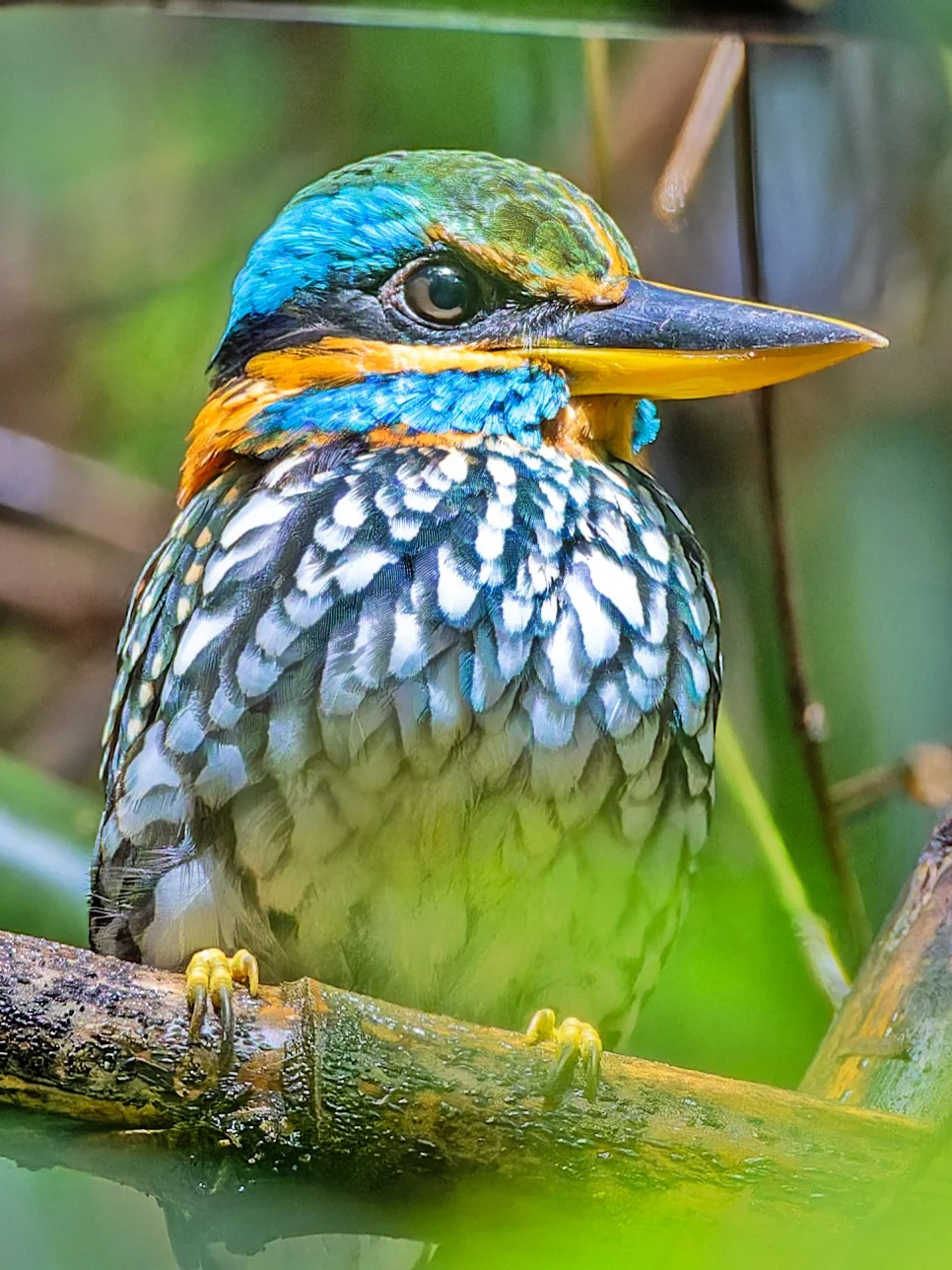 斑林翡翠色彩非常鲜艳独特,根本就不用找辨识点。背部绿色带斑点,腹部白色带鳞纹,头部绿色冠羽,还有各种亮蓝色的胡须纹啊,黄色绿色的各种条纹。