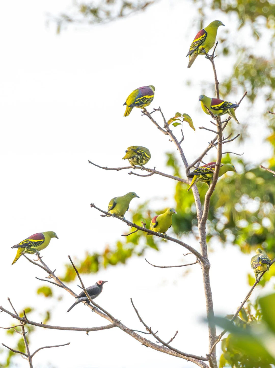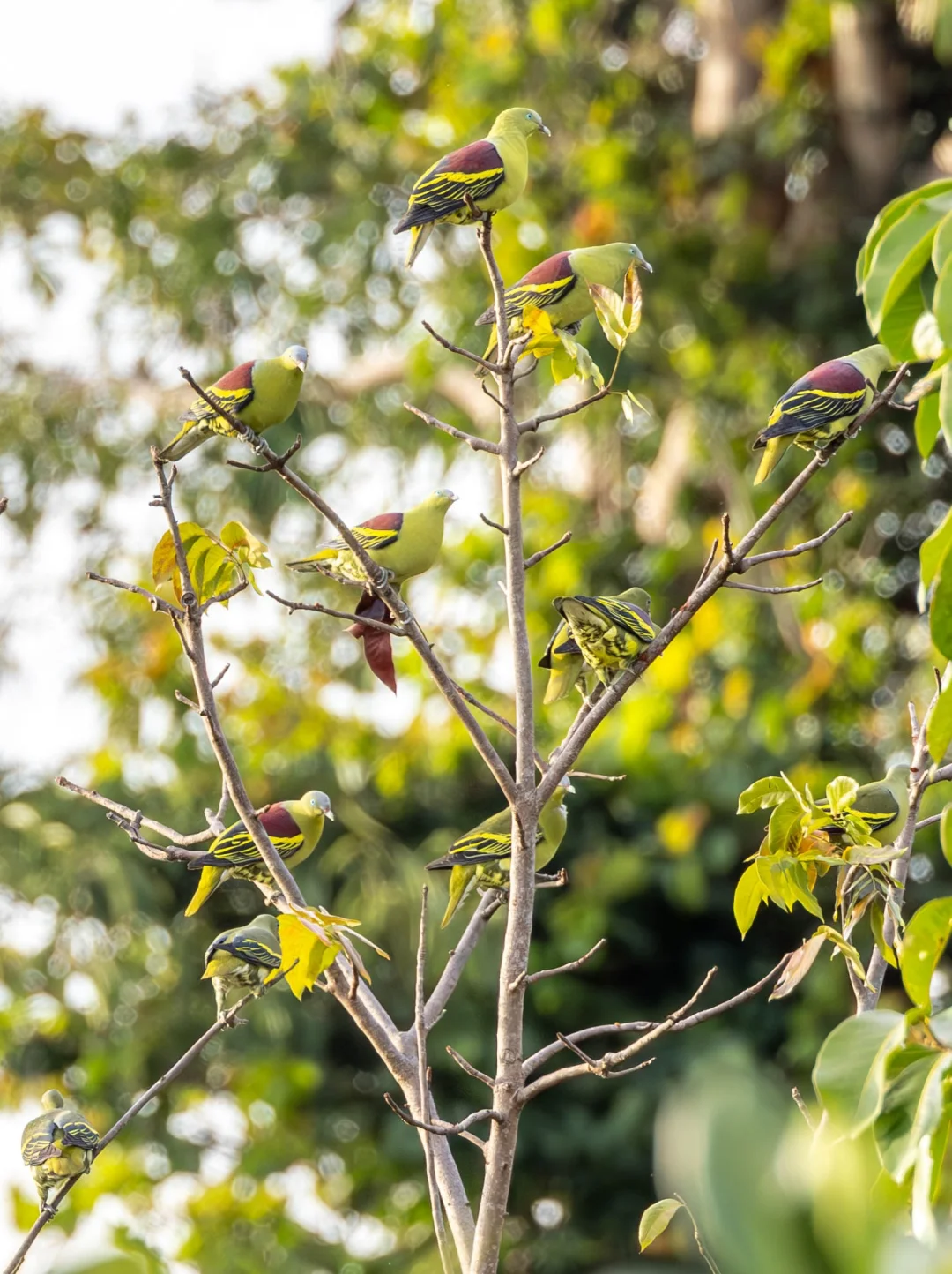 原创拍摄 菲律宾绿鸠,Philippine Green Pigeon,鸽形目鸠鸽科绿鸠属。菲律宾特有的绿鸠,绿鸽子。 雄鸟拥有紫红色的肩部和背部,雌鸟没有是绿色的。菲律宾绿鸠雄鸟有点像厚嘴绿鸠,不过嘴没那么厚,眼周也没有绿色皮肤。 当天观鸟看到一群菲律宾绿鸠回夜栖地,雌鸟雄鸟都落到了一棵树的细枝上,绿鸠们绿绿的,加上雄鸟红色的翅膀,红红绿绿,像是圣诞树,超级热闹和喜庆。