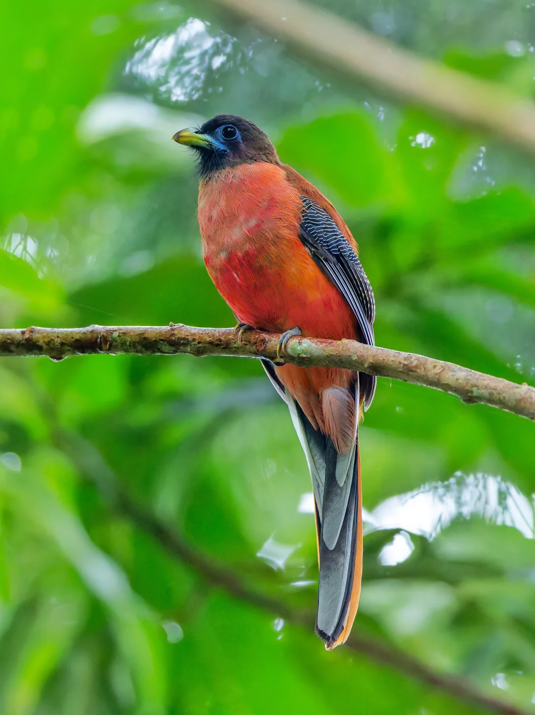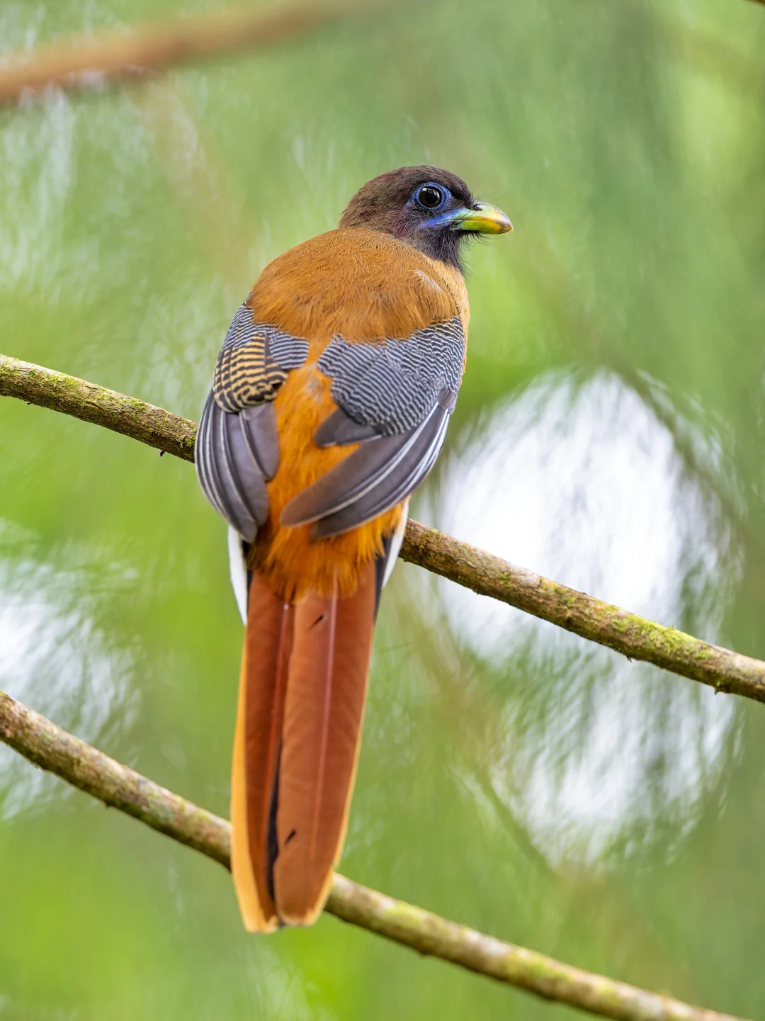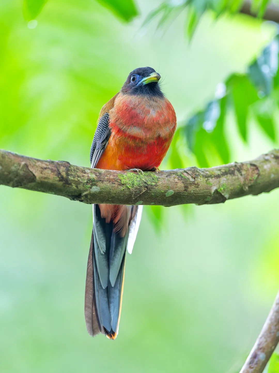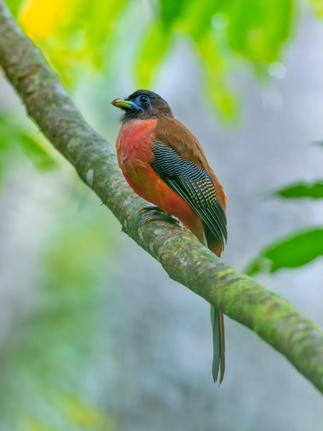 原创拍摄于2025.10 粉胸咬鹃,Philippine Trogon,咬鹃目咬鹃科咬鹃属。英文名字叫:菲律宾咬鹃,分布也在菲律宾,主要是吕宋岛。 我觉得咬鹃都非常漂亮,粉胸咬鹃也是尤其漂亮,雄鸟粉色胸部+红色腹部,而雌鸟是淡黄色的下部。我拍到的这只是年轻的雄鸟,看上去正在换羽成成鸟,可以看成雌鸟(幼鸟和雌鸟相似)和雄鸟的过渡[汗颜R]。 也可能是太年轻,这只粉胸咬鹃不谙世事,不知道世间险恶,离我们实在是太近了,也不离开,太大方,太给面子了,我甚至要退后几米才能对焦[汗颜R]。