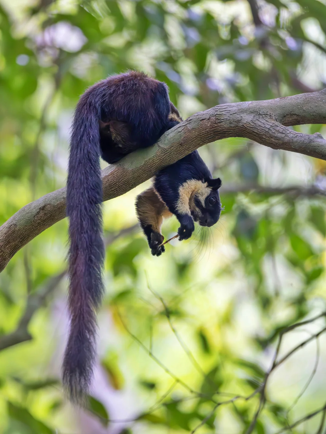 原创拍摄 巨松鼠,Black Giant Squirrel,啮齿目松鼠科巨松鼠属。国家二级保护动物。在我国分布在西南地区,比如云南南部。 巨松鼠真的超级大,蓬松的尾巴就有50~60厘米,背部是深棕色至黑色,腹部和脸颊是黄色,眼睛有惺忪的黑色眼环。 这只在热带雨林里看到的巨松鼠,在树上玩树枝,超级可爱,像一只黑色的小狐狸,尾巴垂下来超级长。