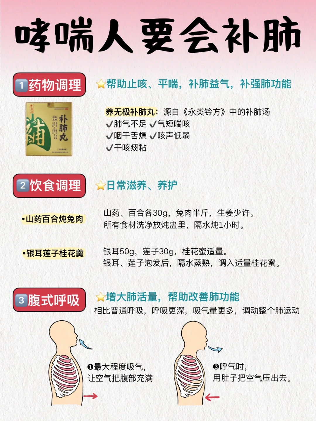 哮喘全名支气管哮喘,是下呼吸道也就是肺部的问题,所以日常坚持养肺补肺是关键!