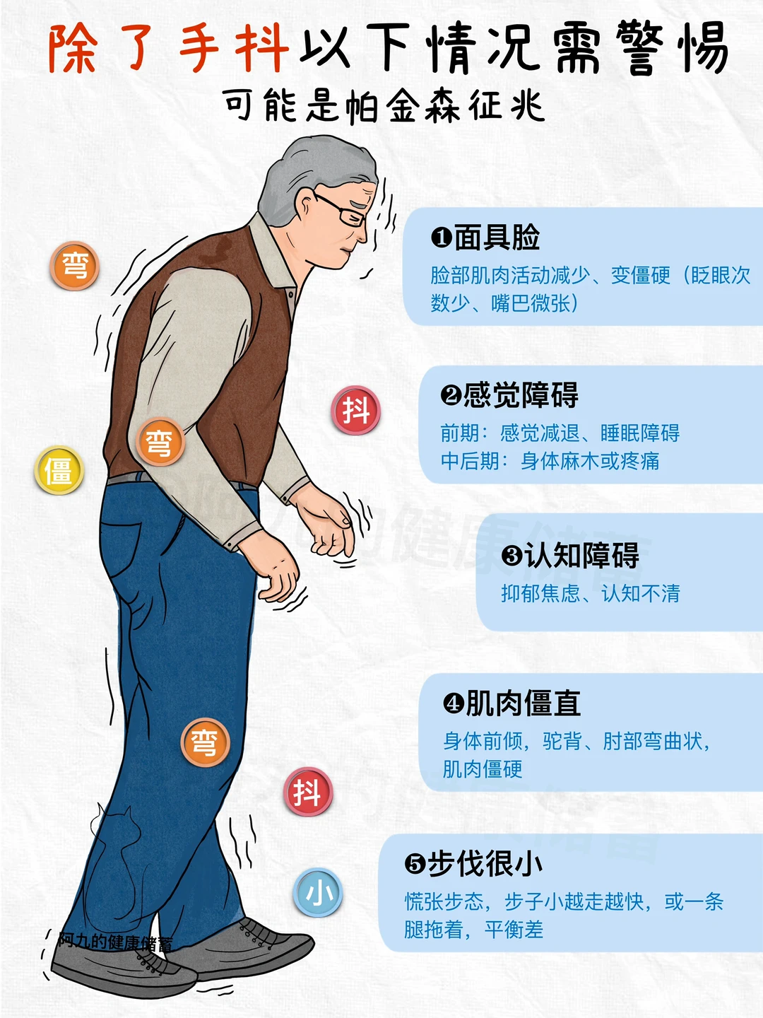 除了静止时手抖,如果伴随着出现面部僵硬、感觉障碍、运动迟缓等,都需要警惕,很可能是帕金森征兆(图2)