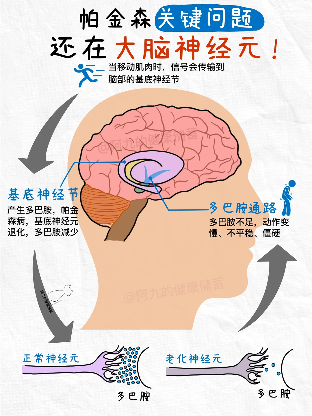 我们大脑里有个地方叫黑质,会分泌多巴胺神经元到纹状体,当这些多巴胺神经元凋零死亡后就会影响我们对身体的控制,所以要缓解帕金森还是要从大脑神经元着手