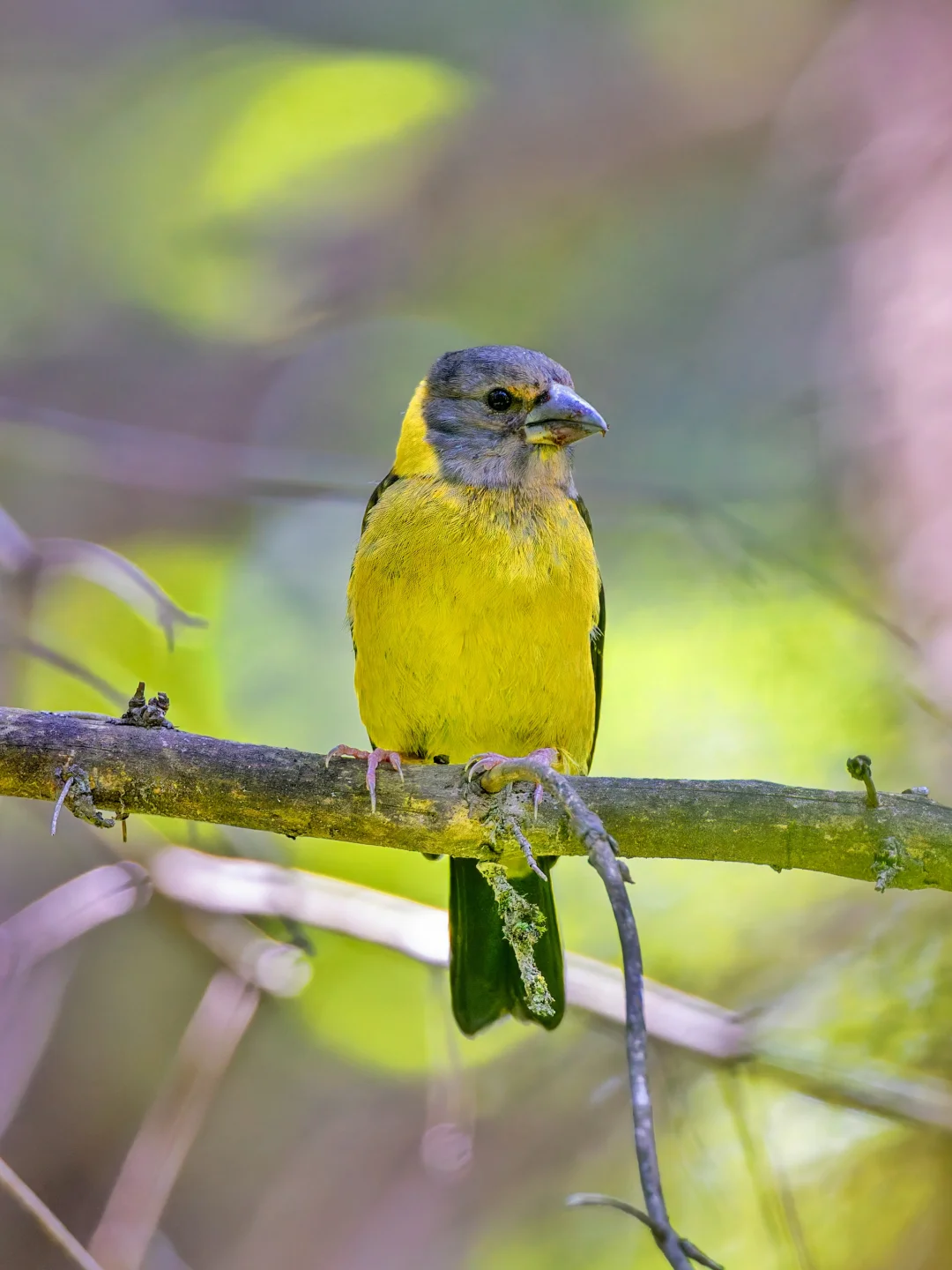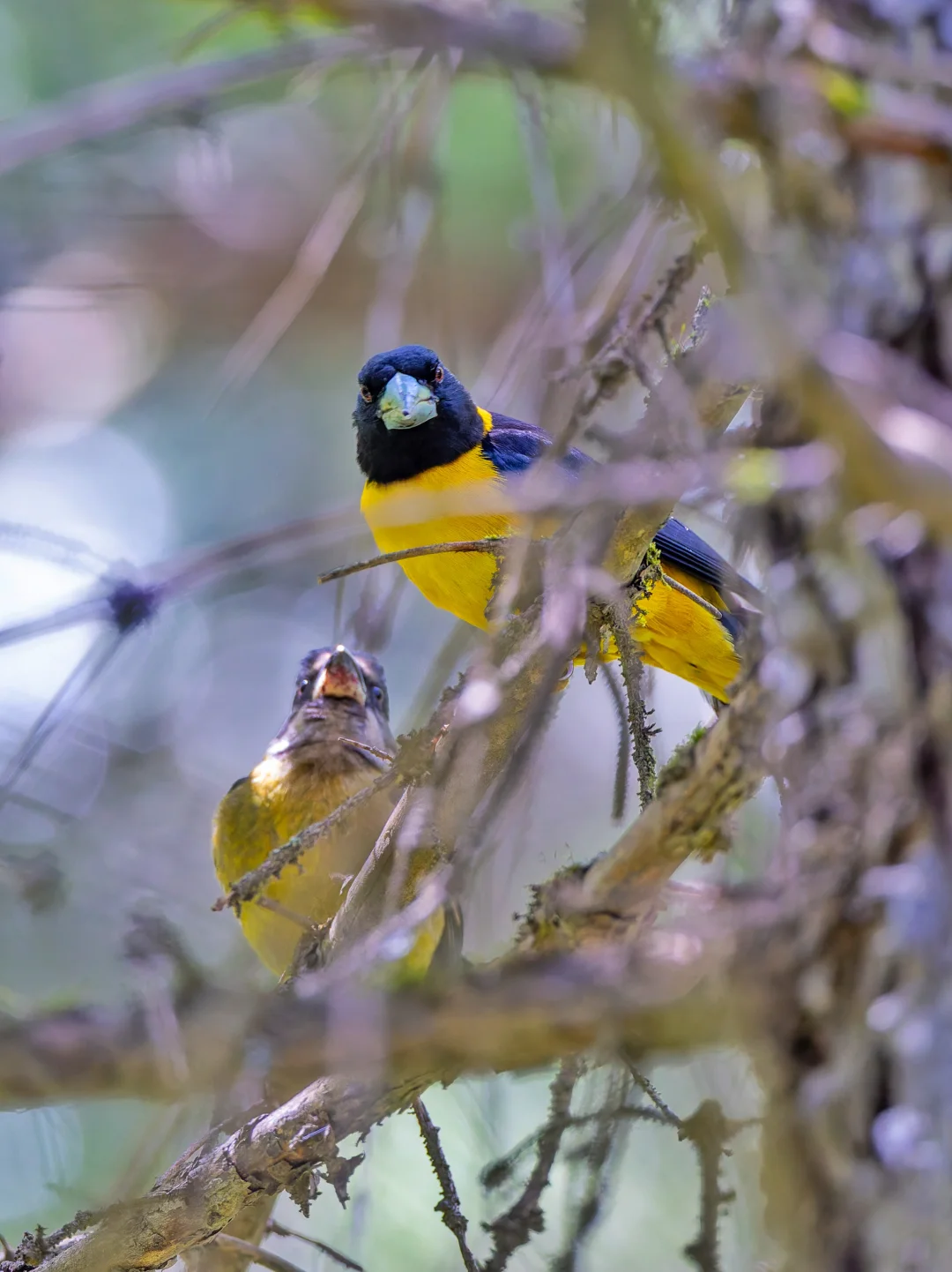 没想到这群黄颈拟蜡嘴雀是亲鸟在带幼鸟,p2的小小幼鸟还在乞食,一家子温馨的很。