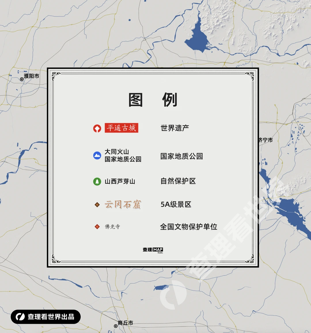 山西是华夏文明的发源地之一,拥有众多令人惊叹的历史文化遗产。比如平遥古城,云冈石窟,晋祠,还包括五台县佛光寺、南禅寺,芮城县永乐宫、广仁王庙等等都是山西最有吸引力的文化名片。带上这张山西省文化旅游地图,让你轻松玩转山西,领略这片土地独特的魅力! ★★★ 原创地图 | 已申请著作权 | 谢绝转载 | 侵权必究 ★★★ 地图 地理 山西旅行 大同 太原 高清地图