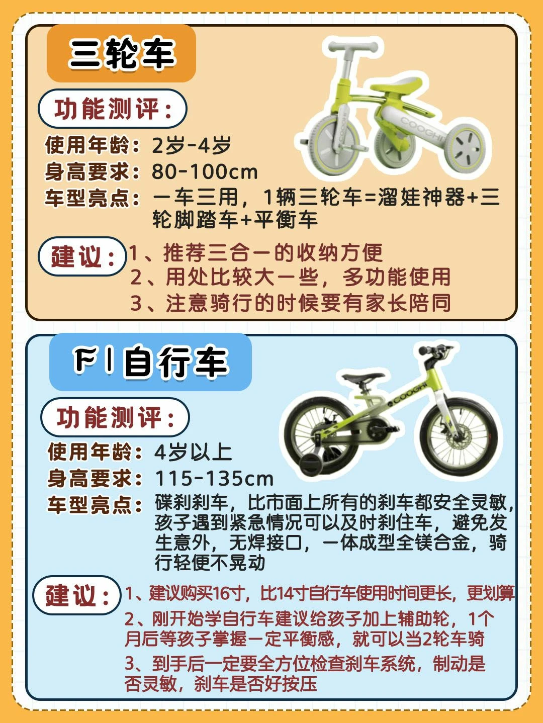 [打卡R]小Tips:尺寸过大或过小都会影响宝宝在转向或踩踏板时的灵活性,易有安全风险,建议选择可随着宝宝身高调节高矮的儿童自行车,使用年限更长,均摊成本低。