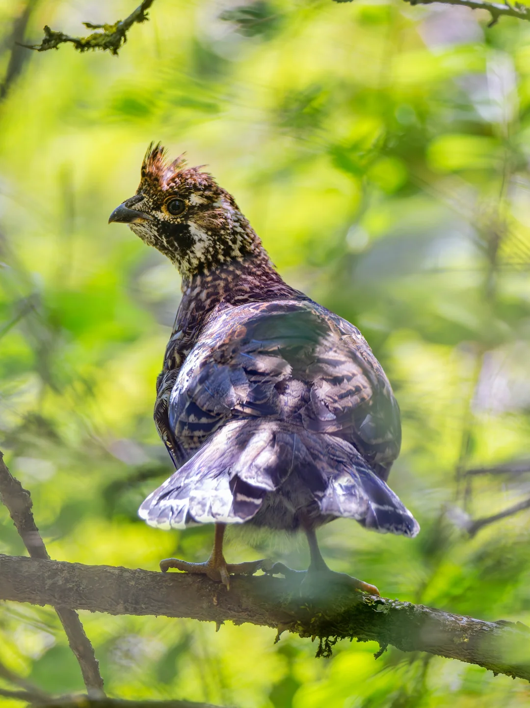 斑尾榛鸡体型看上去相当健壮,主要是脖子粗,有顶冠,全身羽毛是棕色的,腹部有密集的花纹,雄鸟喉部有黑边白线,雌鸟喉部棕色。不过这只看上去未成年。
