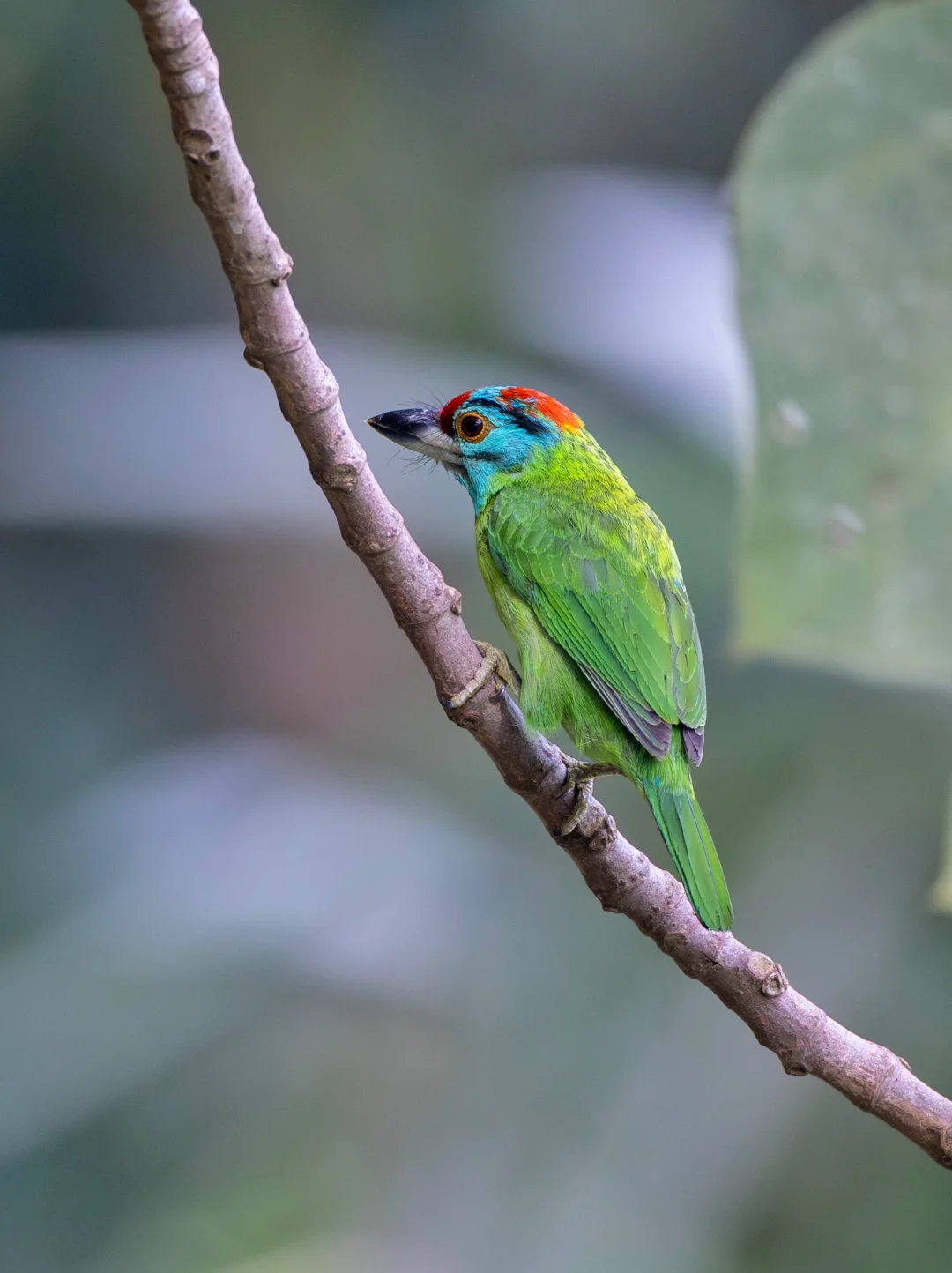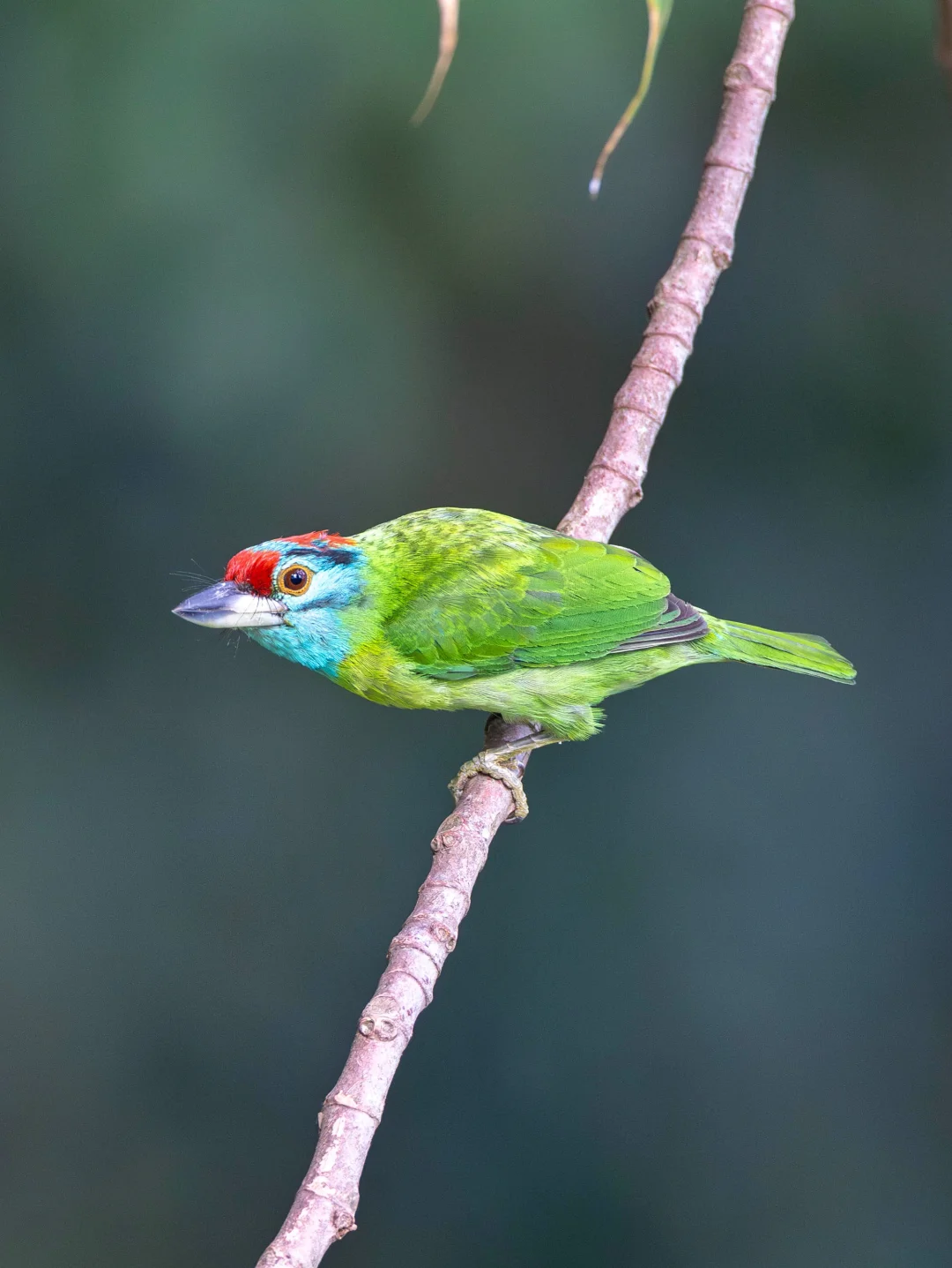 原创拍摄 蓝喉拟啄木鸟,Blue-throated Barbet,䴕形目拟啄木鸟科火簇拟䴕属。是典型的热带森林鸟类,分布于喜马拉雅山麓至东南亚。 蓝喉拟啄木鸟前额到头顶是鲜红色,中间有一条黑色横带,头侧/颏/喉为蓝色,下喉两侧各有红色点斑。 在云南的繁殖季,好像到处都能听到蓝喉拟啄木鸟漫山遍野的叫声,此起彼伏,重复的三到四音节,叫声比其他拟啄木鸟更加温和。