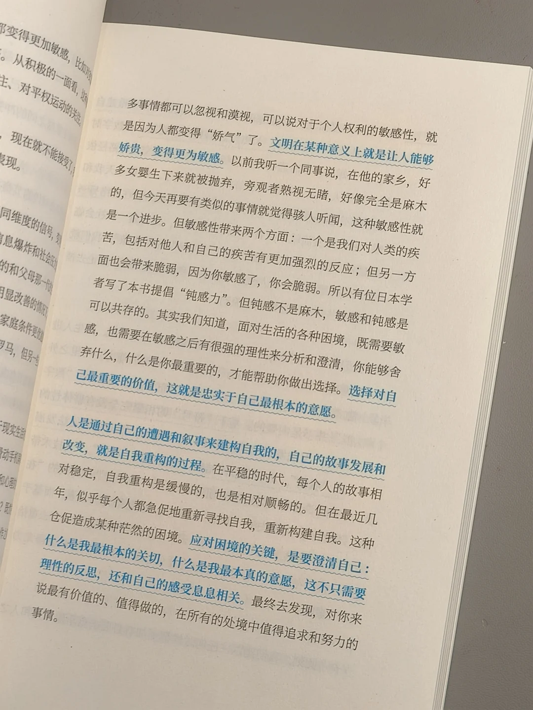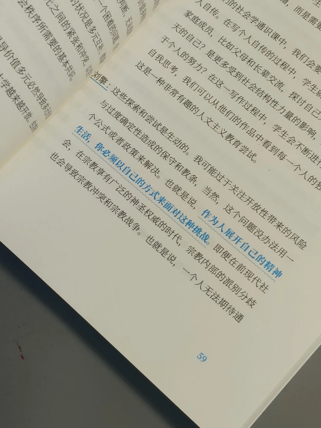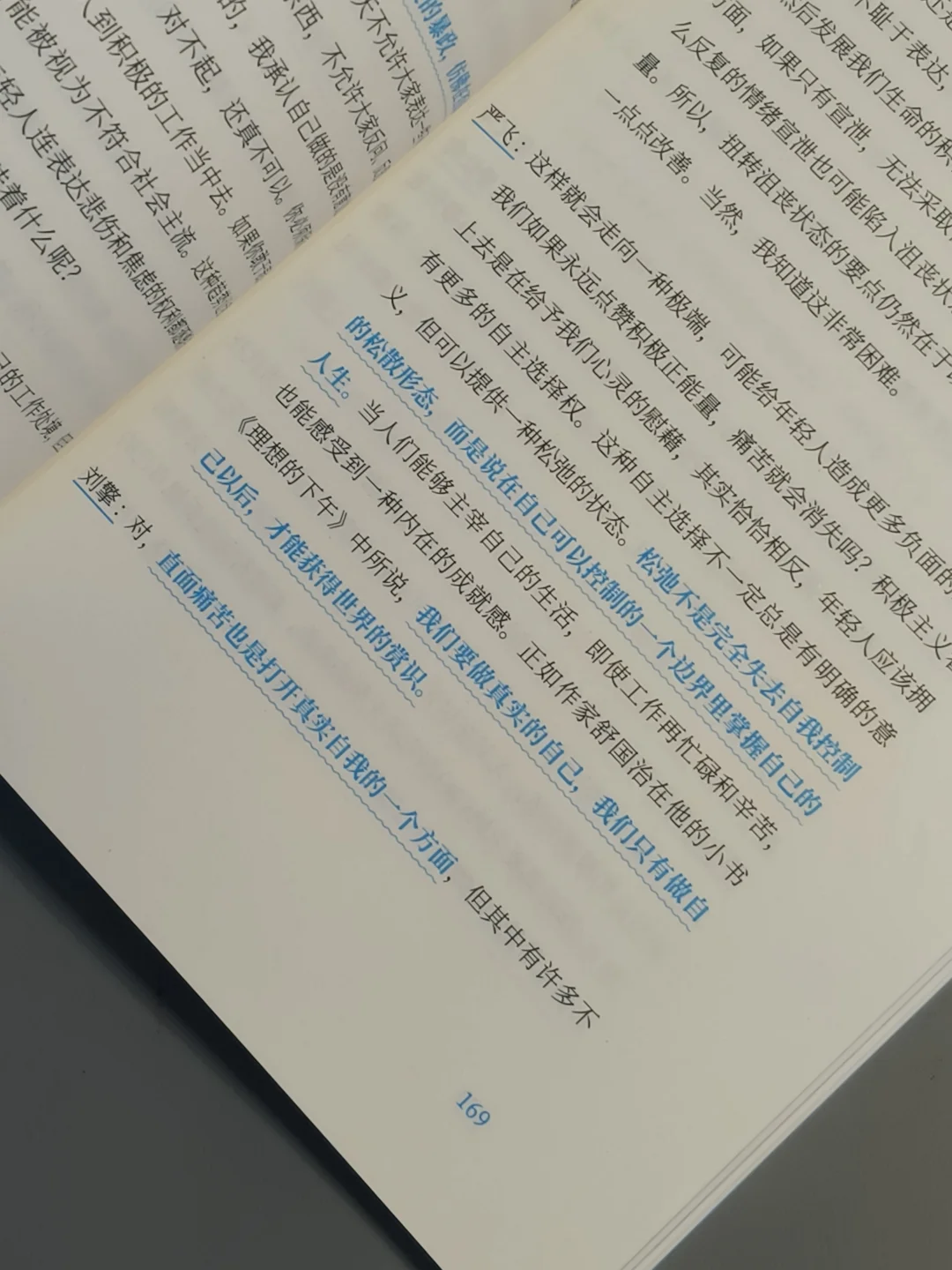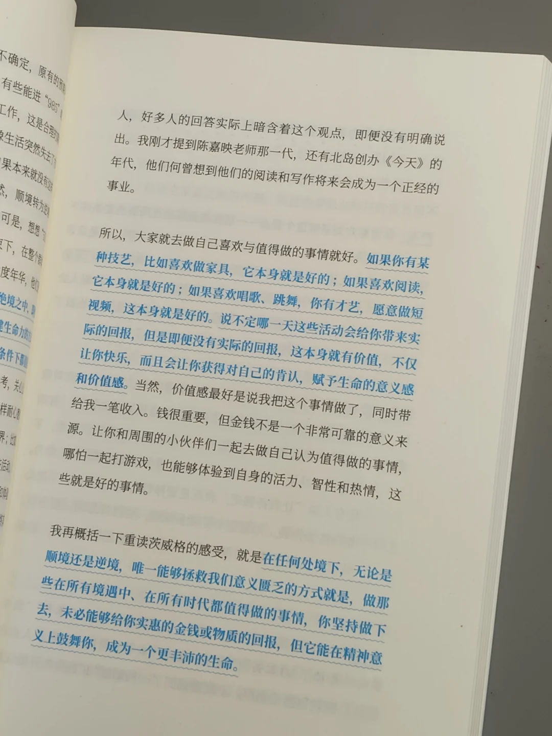 阅读时,我完'全沉浸其中,一页接着一页,欲罢不能。他们探讨的话语深刻又震撼:“我们的身体就是我们的庙宇,我们要不断地去管理这座庙宇。”让我开始重视对身体与心灵的养护;“向世界打开自己,看见多元生'发的可能性。”激励我突破舒适圈,拥抱未知;“现在很多流行的文化产品都是痛苦的镇痛剂。”一针见血地指出当下文化现状;“真正的治'愈是要让你从自我否定的经历中发展出自我成长的积极力量。”则为身处迷茫的人指明方向。