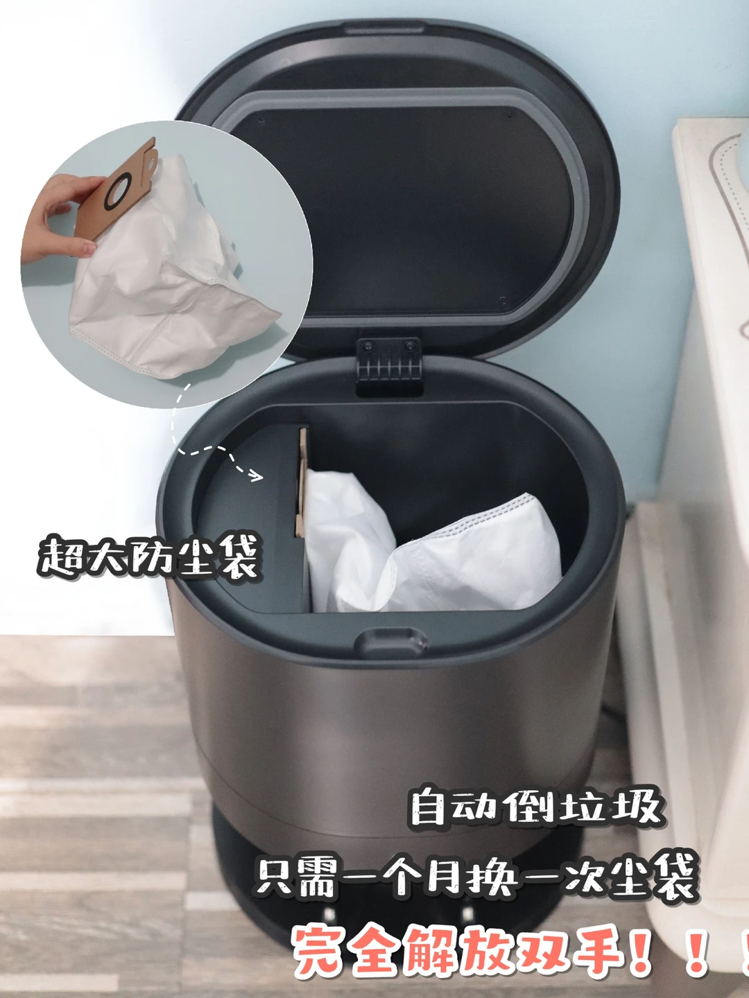 而且它配备了4.3L的大尘袋,我一般都是一个月扔一次就可以,而且密封性很好,不会有异味溜出来,亲测确实OK~
