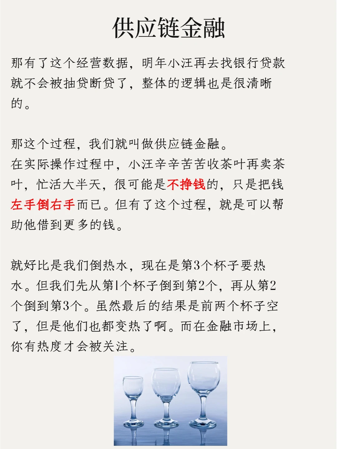 那这个过程,我们就叫做供应链金融。在实际操作过程中,小汪辛辛苦苦收茶叶再卖茶叶,忙活大半天,很可能是不挣钱的,只是把钱左手倒右手而已。但有了这个过程,就是可以帮助他借到更多的钱。