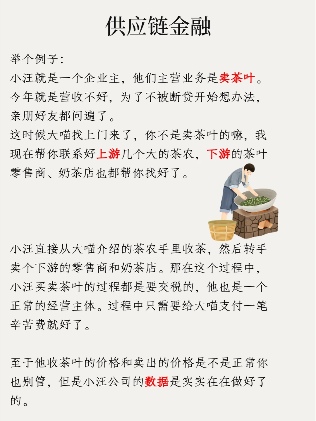 小汪就是一个企业主,他们主营业务就是卖茶叶。今年就是营收不好,为了不被断贷开始想办法,亲朋好友都问遍了。这时候大喵找上门来了,你不是卖茶叶的嘛,我现在帮你联系好上游几个大的茶农,下游的茶叶零售商、奶茶店也都帮你找好了。