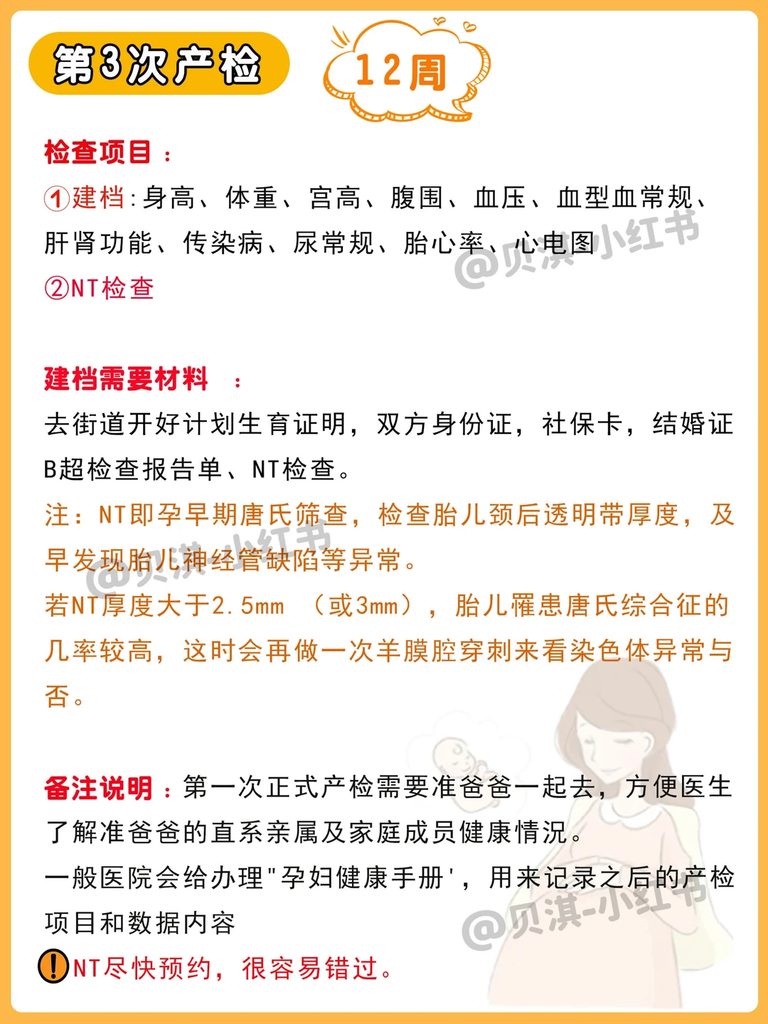 孕期产检大全,孕妈们一定要记得重要的产检时间,千万别错过! 🌈其中有三项很重要的检查需要提前预约: 🔸NT检查 🔸大排畸 🔸小排畸 12周建档时记得问清楚是否需要预约,希望每位孕妈都能产检顺利,生下肉肉的可爱宝宝[飞吻R]