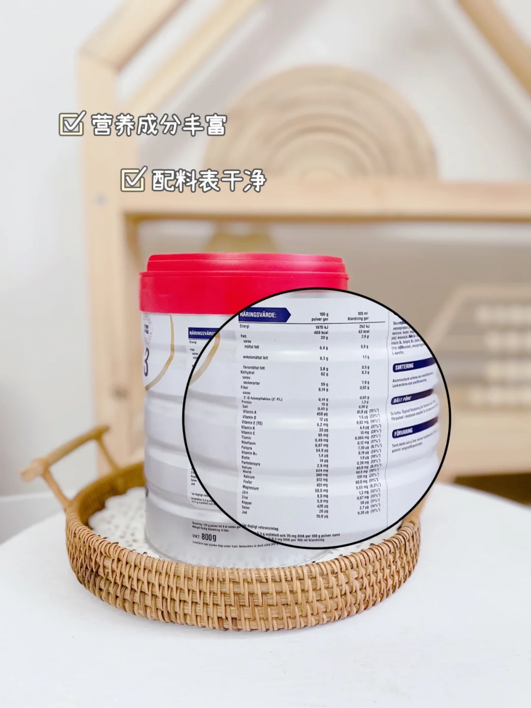 但是不同品牌的HMO奶粉,或多或少有些差异,在我做过一番功课后,决定给宝宝安排了森宝红罐,在国内比较低调,但它是北欧那边80多年的老牌子了,配方比较适合像我家宝宝一样肠胃功能偏弱、不爱长肉肉的宝宝,里面含有HMO、MFGM、OPO、益生元、益生菌等,而且乳糖含量占比高,另外森宝3段奶粉在钙、铁、维生素D等关键营养素方面含量也比较高,适合一岁以上的宝宝。