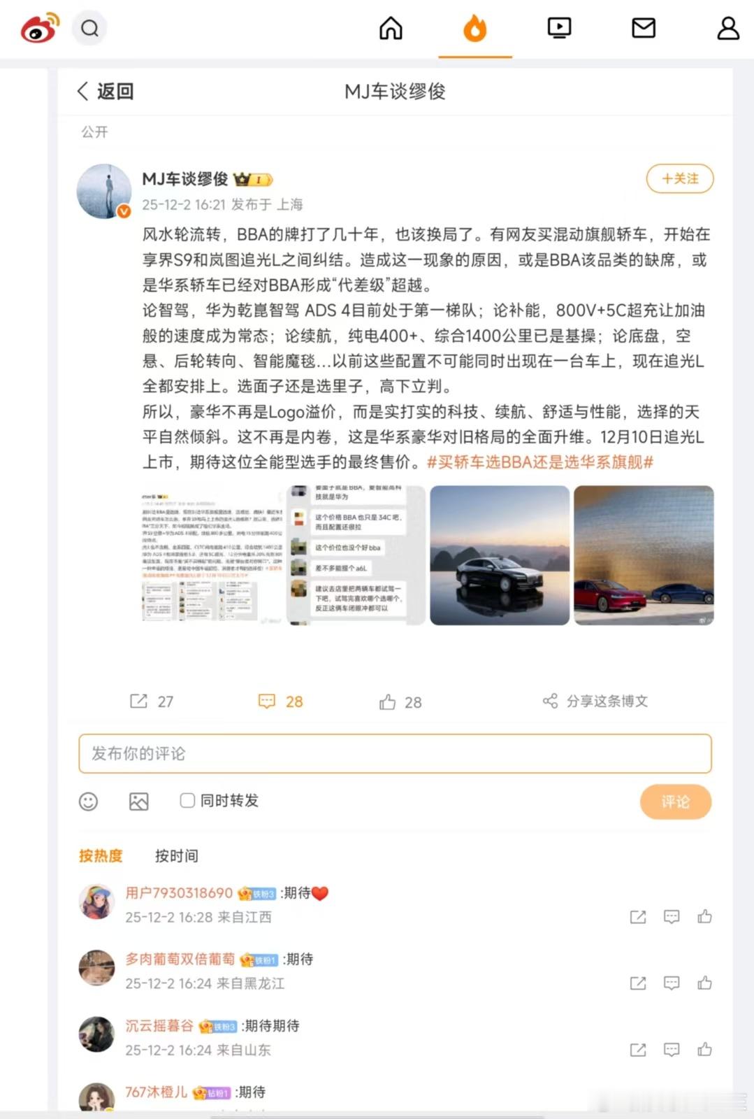 别光看“华系”热闹,得看技术门道。就拿即将上市的追光L来说,几个硬指标直接定格局:- 充电速度:行业首发最快800V 5C超充平台,12分钟,也就是喝杯咖啡的时间,电量便可从20%充到80%。这不是快,这是直接重构纯电出行节奏。- 续航真值:纯电续航410公里(CLTC),混动轿车全球第一。按一天往返40km算,日常通勤两周一充,跨城出行综合1400公里,彻底告别焦虑。- 底盘黑科技:智能魔毯底盘+后轮转向。魔毯提前感知路面,主动调整悬架;后轮转向让5米级车也有A级车的灵活。舒适和操控,这次全都要。技术是底气,这些点才是让用户从“观望BBA”到“纠结华系”的根本原因。买轿车选BBA还是选华系旗舰