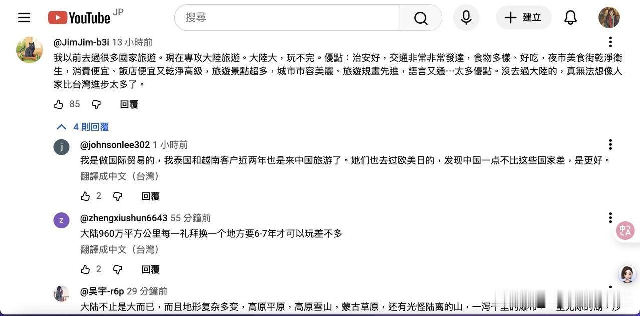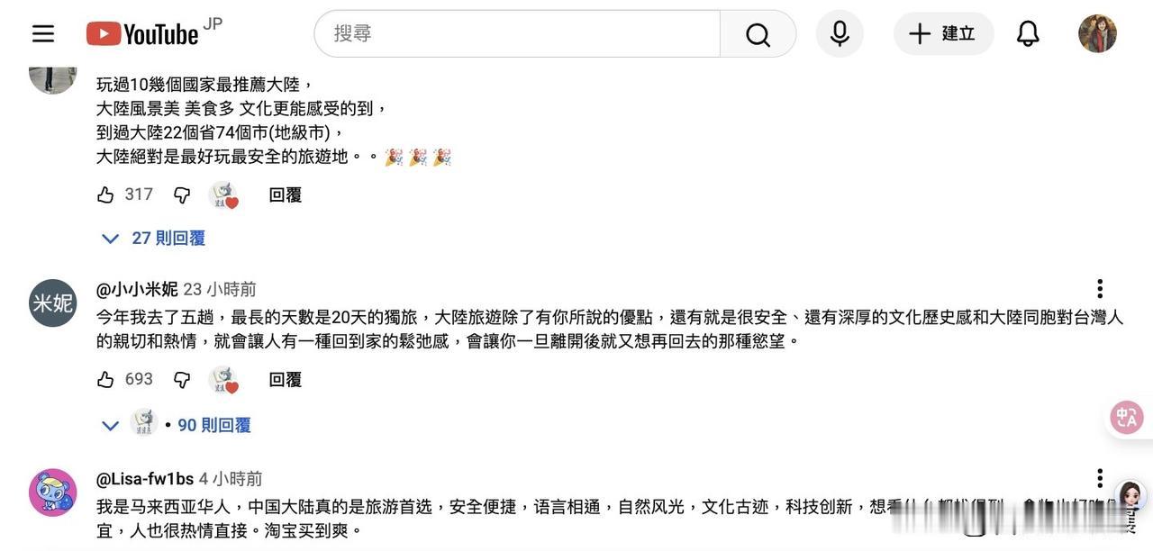 昨天才说脸书朋友询问来大陆的事,这不,今日看到台湾博主视频下的留言板:很多台湾人来大陆旅游,除了旅游的性价比优外,最主要是同文同种,到哪儿都看得懂文字、指示,想吃啥,看得懂食材与各地区的烹饪属性,更别说要买个土特产回台,都不需要特别解说,想啥买啥,易买又易得,便宜又拿得出手。 于是就有许多人用岛内旅游的相关费用来与大陆旅游比较,不比不知道,一比吓一跳,在岛内的花费比在大陆高1.5 - 2 倍,而且还不尽兴。 这里面有很多都是首来族啊,彻底刷新他们对大陆的认识与认知。想想,这一大群人回台后,应该会驳斥媒体的虚伪报导,甚至广为宣传自己到大陆旅游后所看到的真实情况。 台湾人游中国 台湾个人游签证 台胞看大陆