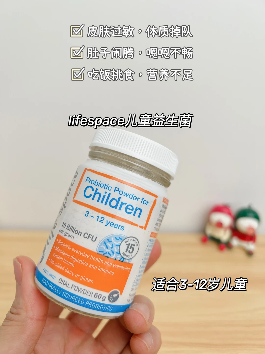 [爱心R]【阿九好物推荐】比如lifespace儿童益生菌就是多菌株配方的选择,非常适合3-12岁的孩子补充,一克足足有100亿高活性,15种菌株+益生元耐胃酸耐胆汁,其中还包括了一款专利菌:乳双歧杆菌BI-04,不仅保护上呼吸道,还能提高免疫力;另外14种亲和儿童肠道的益生菌像是LGG、HN019等菌株,助力好菌壮大!对肠道健康很有好处,而且还有澳洲TGA的认证,妈妈们可以放心选择。