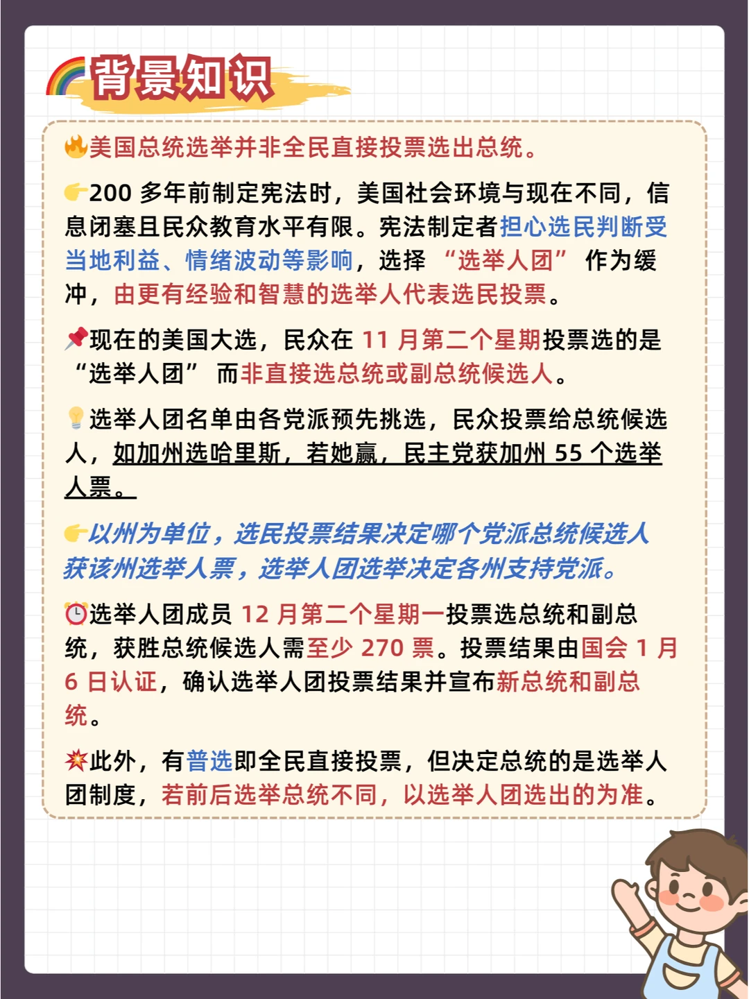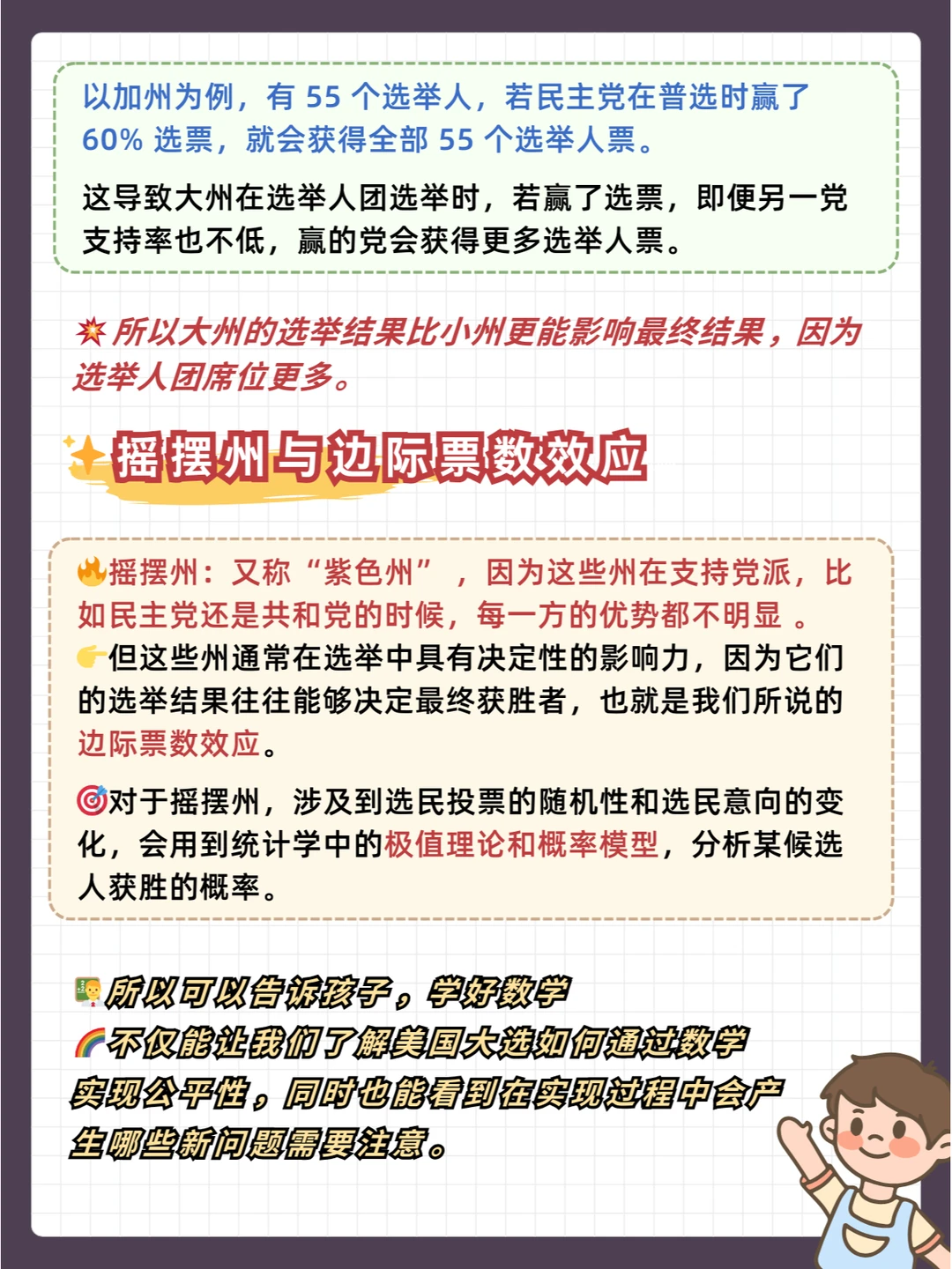 2️⃣ 摇摆州的重要性:摇摆州的选票对于大选结果至关重要。可以用简单的比例问题让孩子理解,比如某个摇摆州的选民数量占全国选民数量的一定比例,而该州的投票结果可能会影响整个大选的走向,让孩子明白部分与整体的关系。 ✨