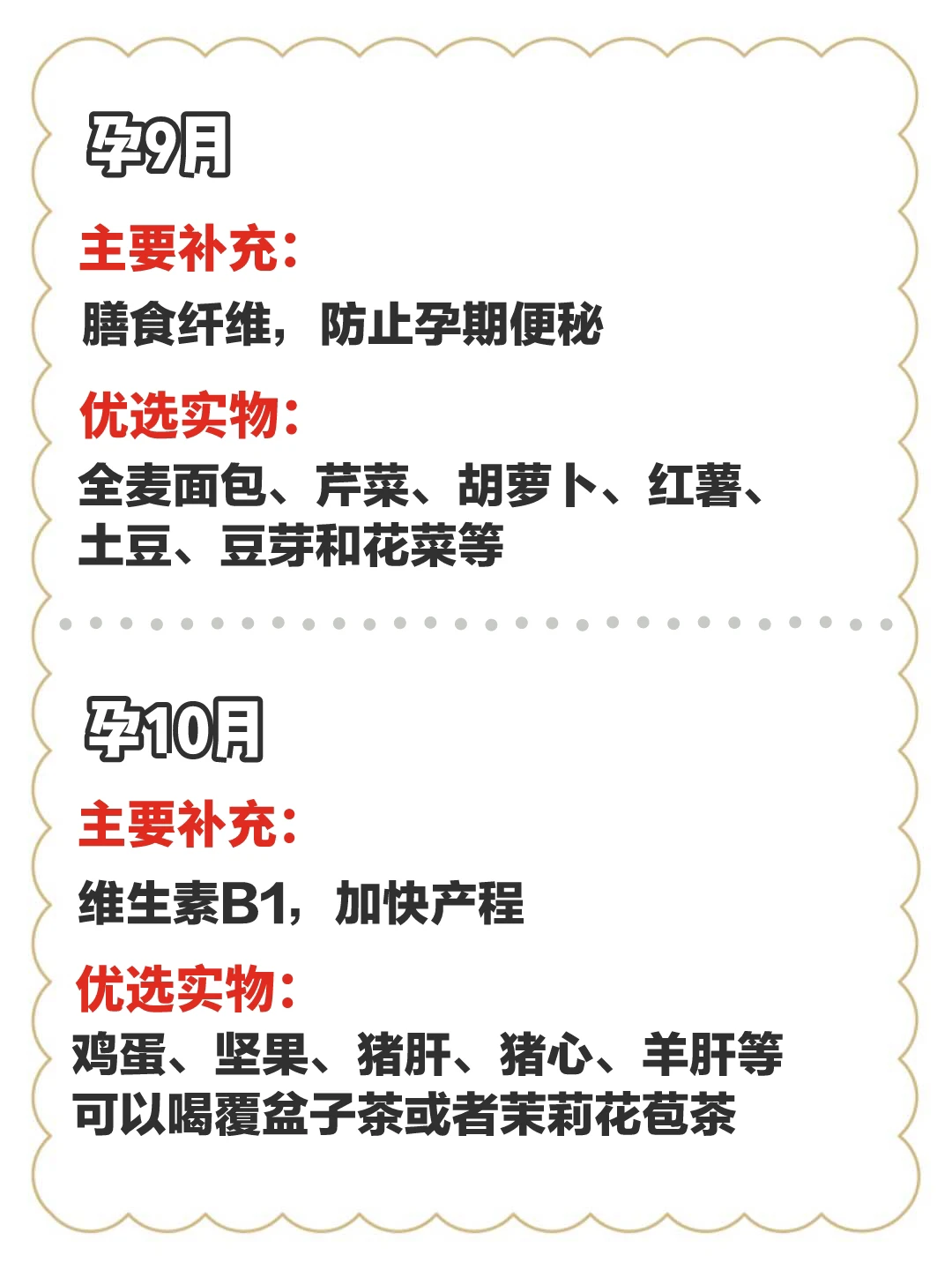 ❤怀10月:补充各类维生素和足够的铁、钙、充足的水溶性维生素,以及硫胺素