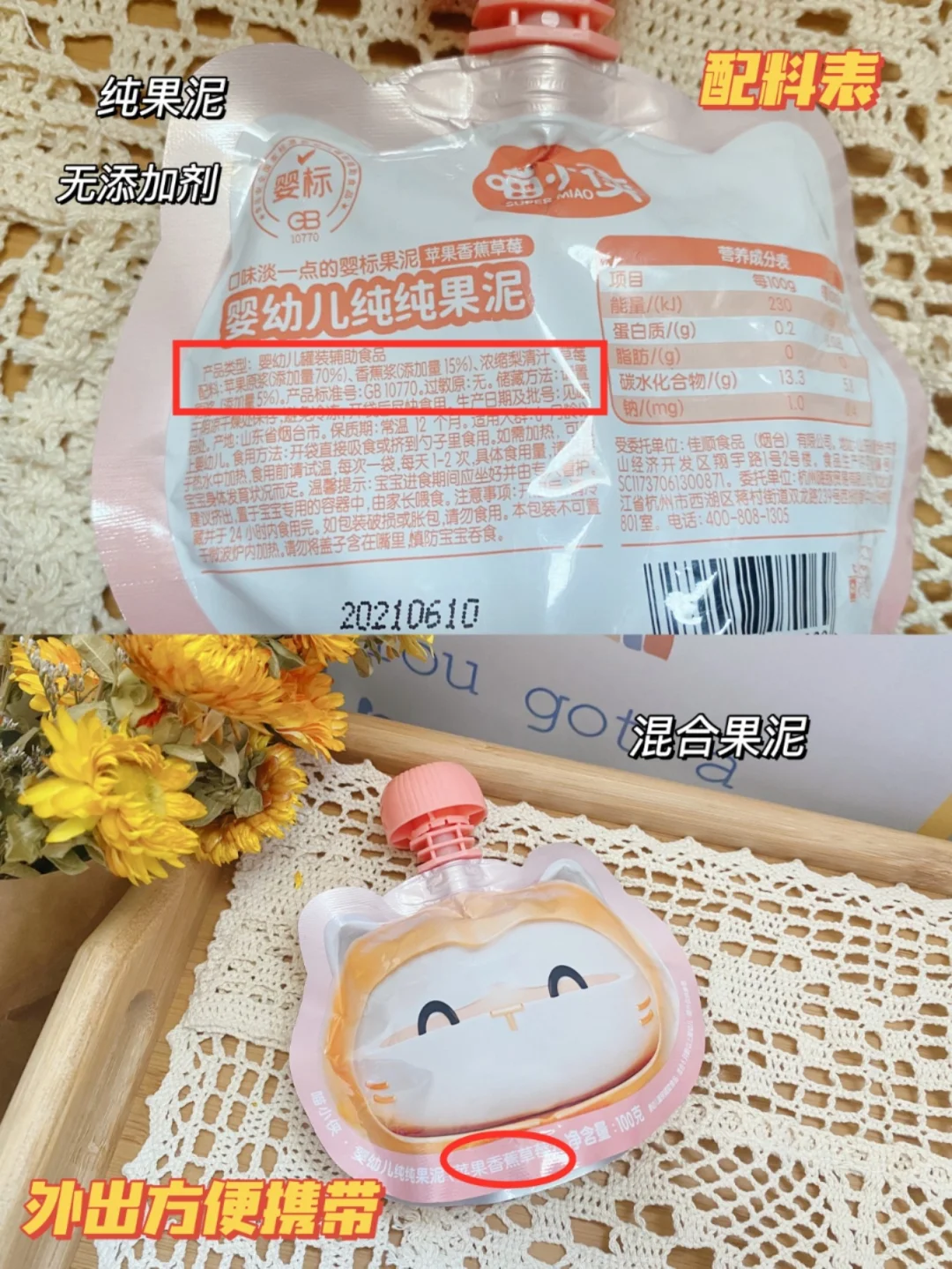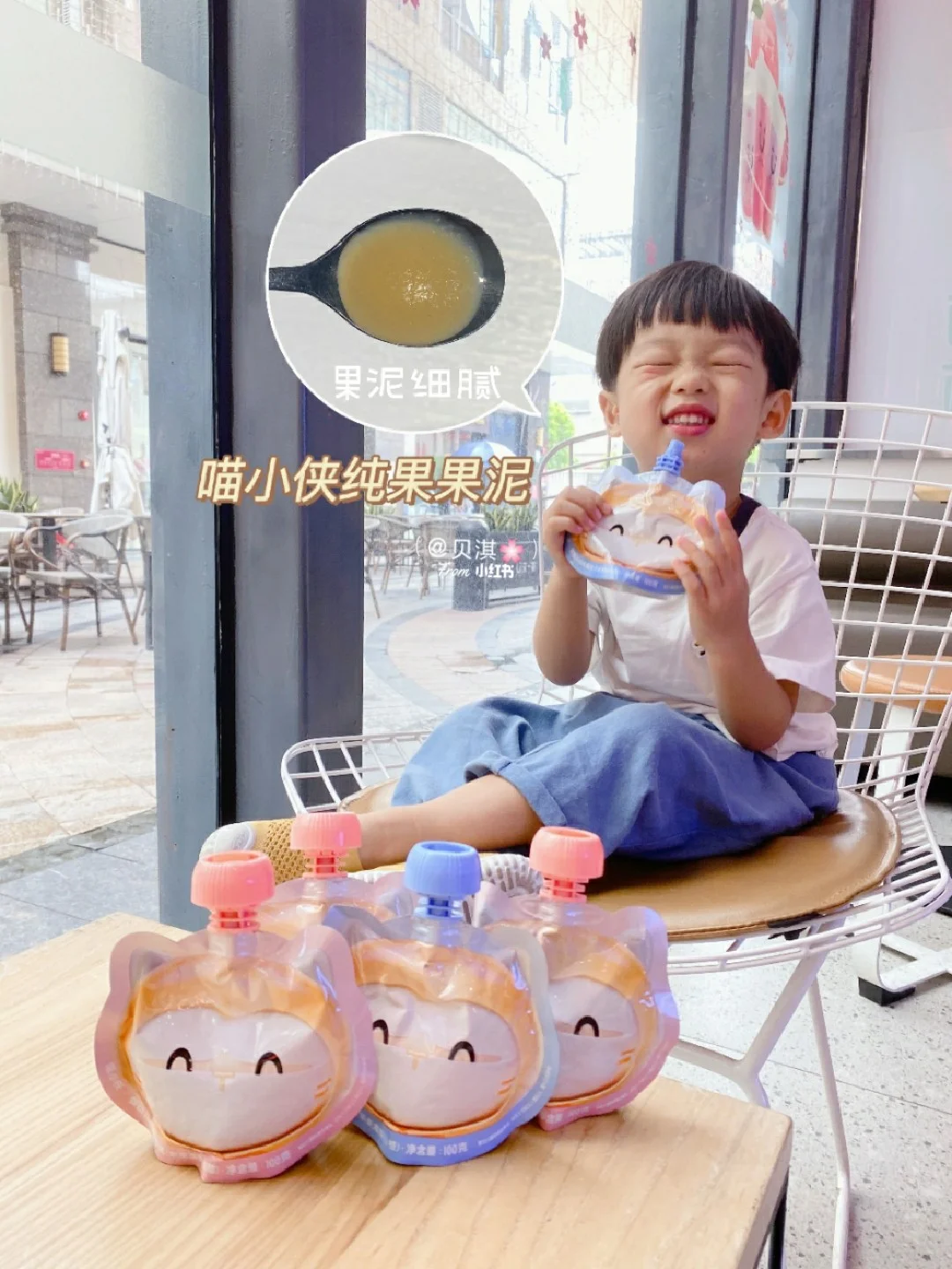 👉果泥可以自制,但是每次做完后吃不完,尤其是混合型果泥,有些水果是不适合混合的,并且很难储存并保持新鲜,外出门时也不方便携带。不想自制果泥的妈妈也可以像我一样,选择喵小侠这样的成品果泥:🤗