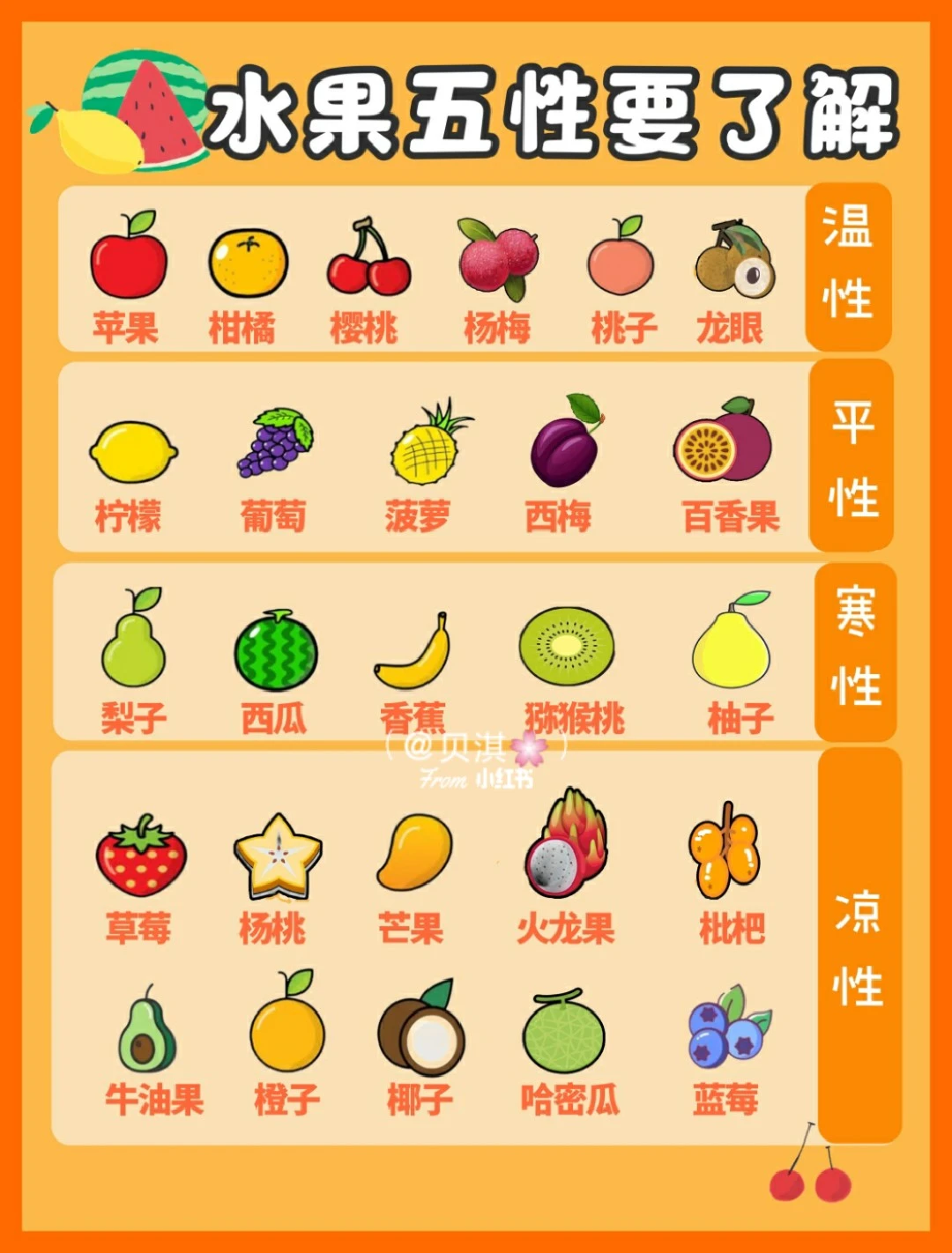🔻寒、凉性水果:清热去火,可以润肺,适用于热性体质的宝宝