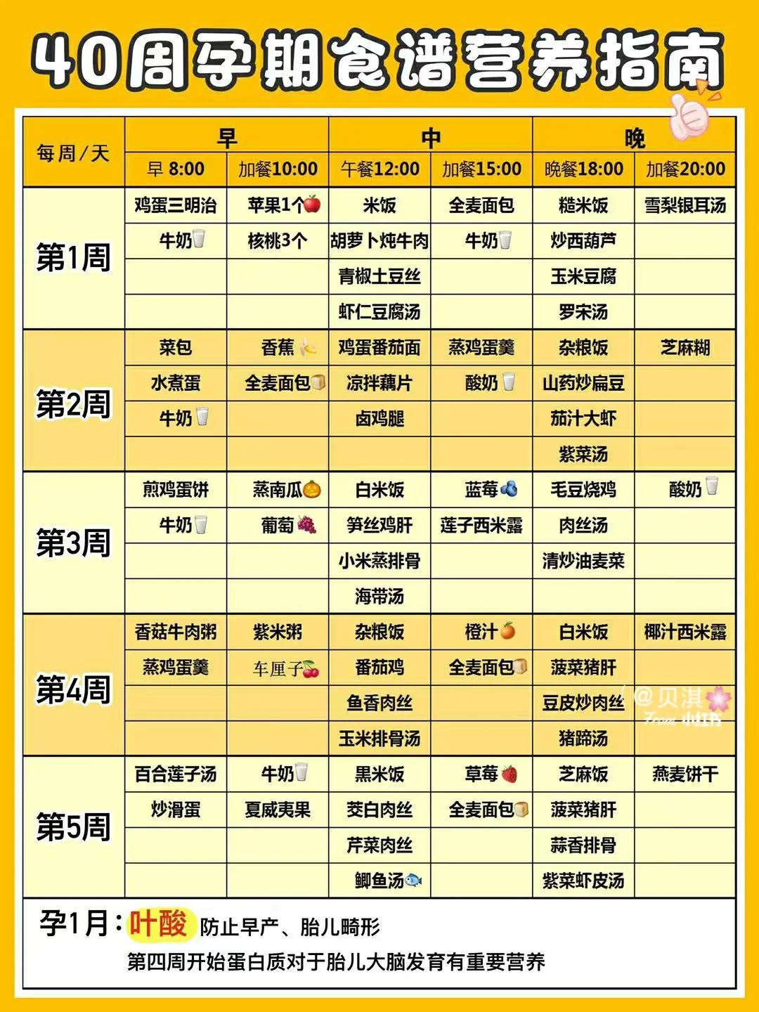 之前整理的孕期饮食禁忌很受大家欢迎,但是很多准妈妈表示不知道孕期到底吃什么才好!今天就给大家分享妇产科婆婆为我定制的孕期餐谱[斜眼R],长胎不长肉,从怀孕1-40周每周吃什么,都写得很明白,还在为吃什么而发愁的准妈妈可以直接保存打印呢~[得意R]