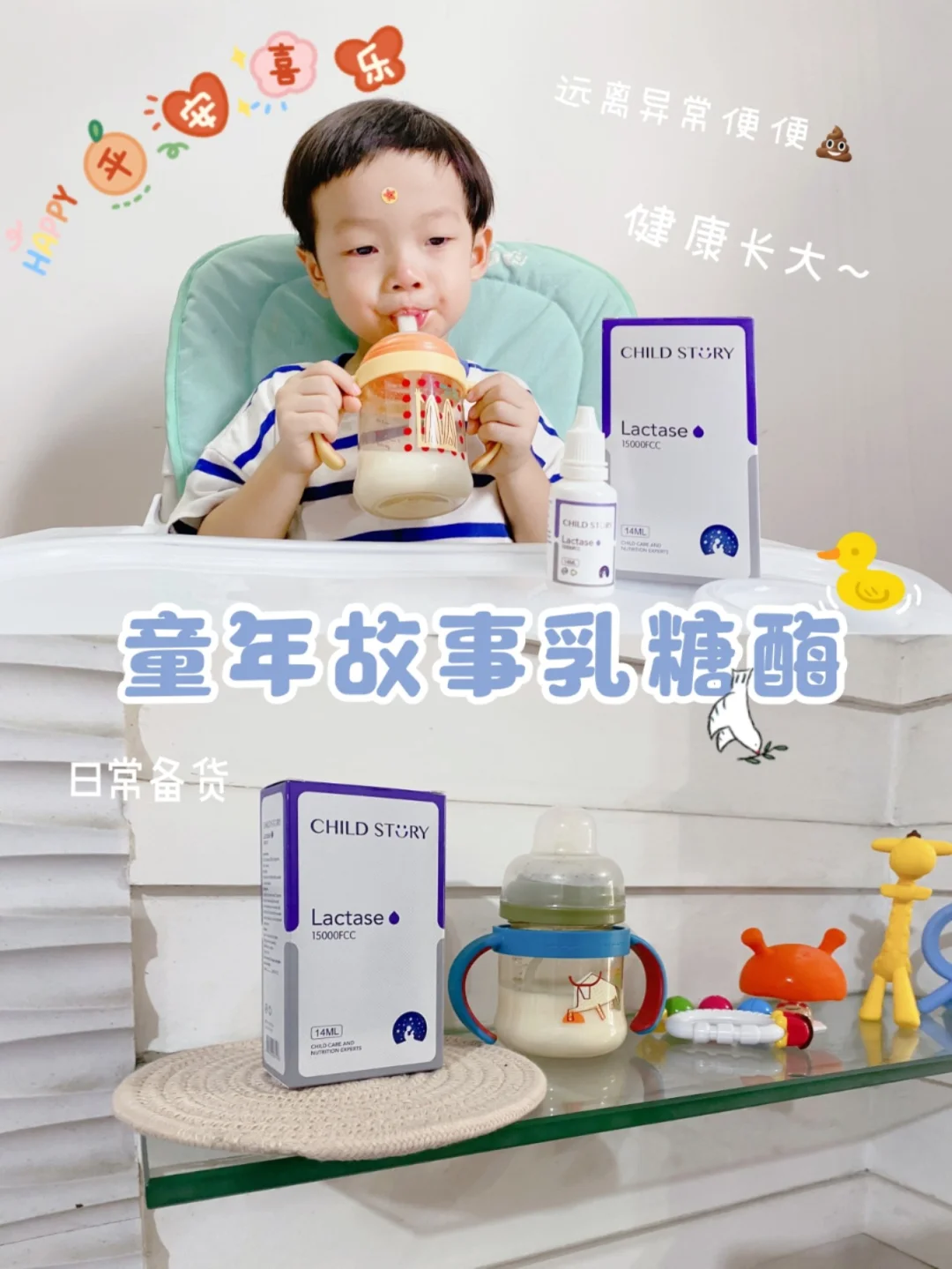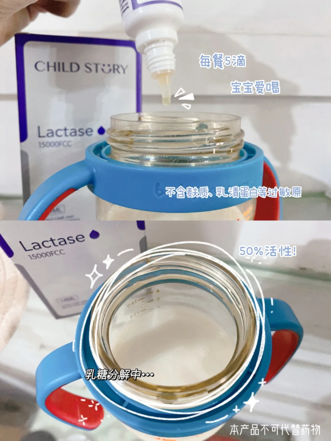 我家里备的童年故事乳糖酶,成分简单,没有麸质、乳清蛋白等过敏源,酸性乳糖酶不易被胃酸中和。在奶粉中滴入5滴即可,奶粉还是原来的奶香味,宝宝不排斥。
