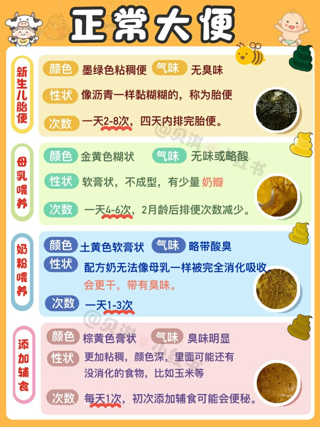 自分享辅食表和奶粉挑选攻略之后[暗中观察R],每天被新手妈妈问得最多的就是☞“宝宝腹泻”“宝宝大便有好多泡泡”“宝宝便秘”等等,👶🏻便便在一定程度上反映了宝宝的健康状况!今天就带大家了解正常的排便频次、不同颜色的便便代表着什么吧[得意R]