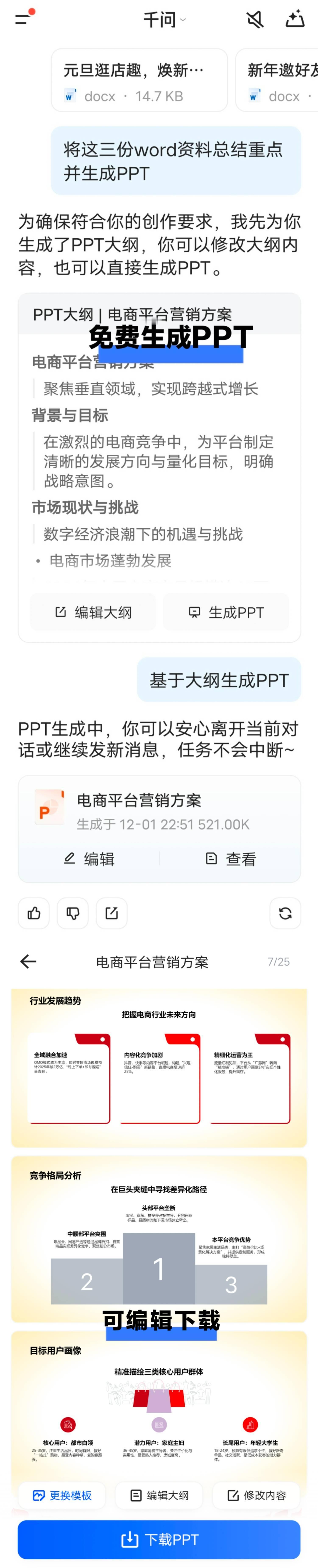 终于找到省钱秘诀!免费千问一年帮打工人省去3000元 听说ChatGPT收费才能用的功能,现在千问全免费!我立刻独宠千问APP!升级版的千问更强了,全体裁写作、生成PPT、格式互转…统统免费!日常办公90%的需求它都能扛,比如领导扔几份word资料,需要总结并做成PPT,我们直接在对话框输入指令“将这三份word资料总结重点并生成PPT”,很快就能获得排版好的文档。关键这不用花一分钱,真的很值。我大概算了算,以前用wps每年就花了129元,ChatGPT每年约1700元,光这些就花了近2000!幸好现在有了千问,省下来的这些钱都够吃几顿好吃的犒劳自己了!