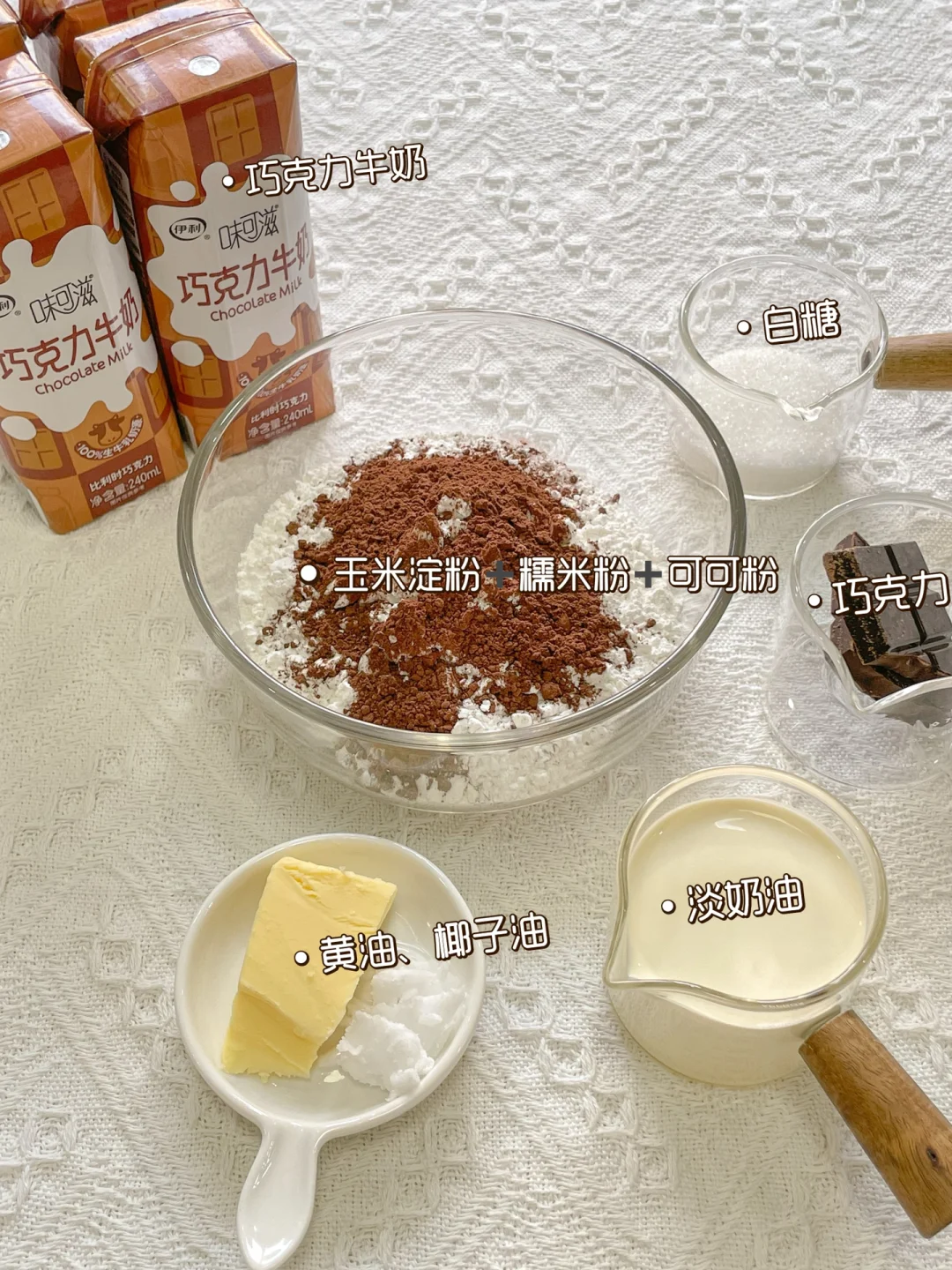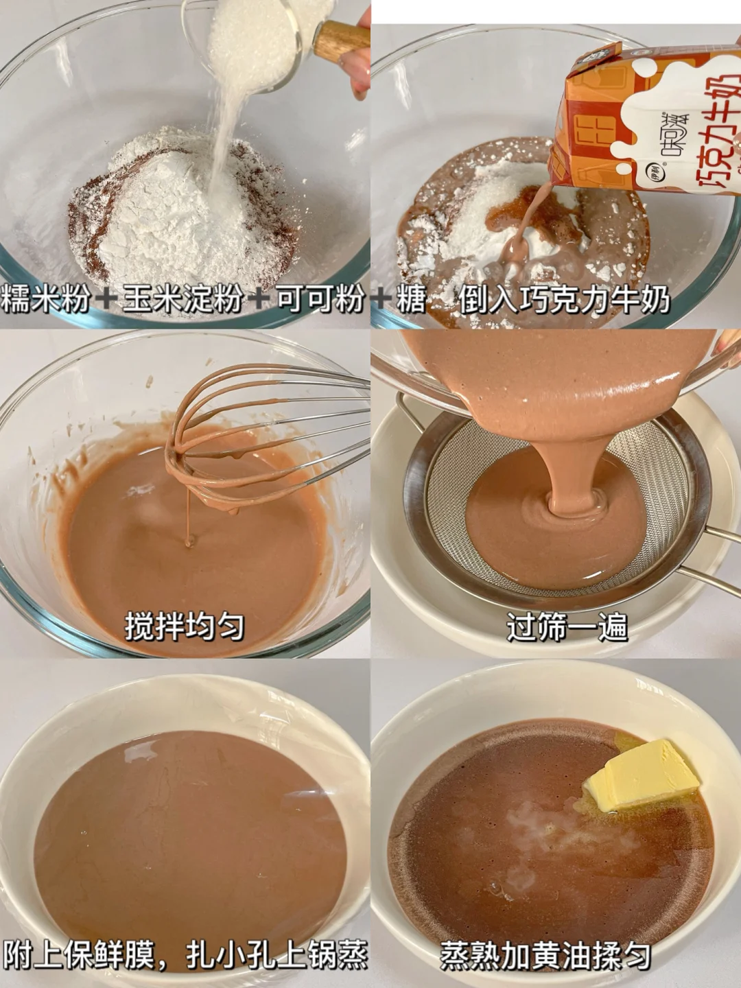 1⃣️糯米粉+玉米淀粉+可可粉+糖+巧克力牛奶搅拌均匀,过筛一遍,附上保鲜膜,扎几个小孔,上锅蒸20分钟,蒸熟后加黄油揉匀反复拉扯更Q弹,揉成光滑面团。