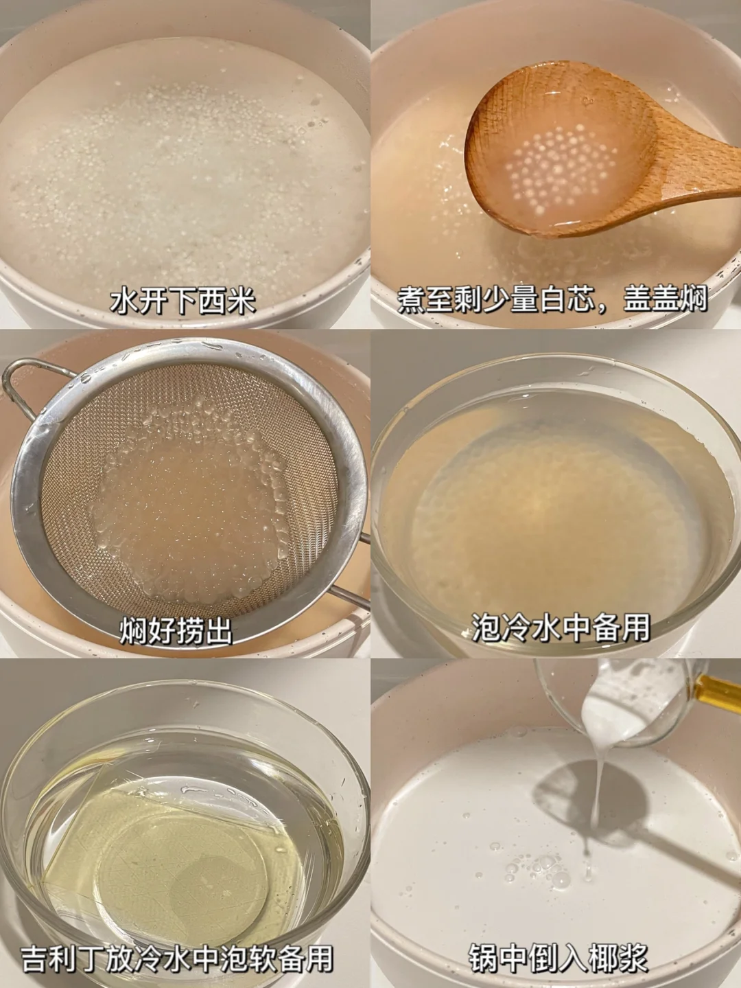 1⃣️水开下西米煮至剩少量白芯,盖上盖子焖10分钟捞出,放冷水中备用。吉利丁片提前放冷水中泡软备用。