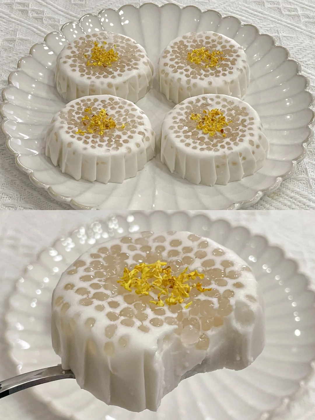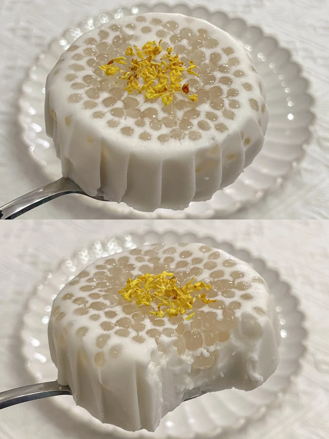 3⃣️模具中先放一层西米打底,倒入煮好的椰浆,放冰箱冷藏2小时左右,凝固后脱模即可开吃。