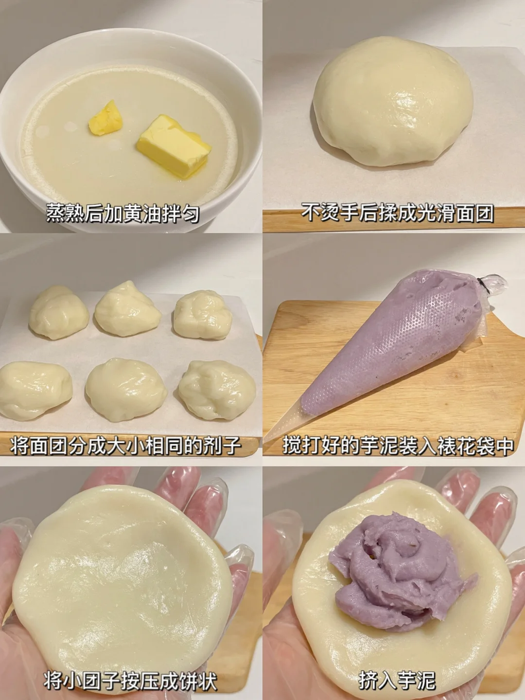 2⃣️蒸熟后加黄油拌匀,不烫手后揉成光滑的面团,将面团分成大小相同的剂子,搅打好的芋泥装入裱花袋中。