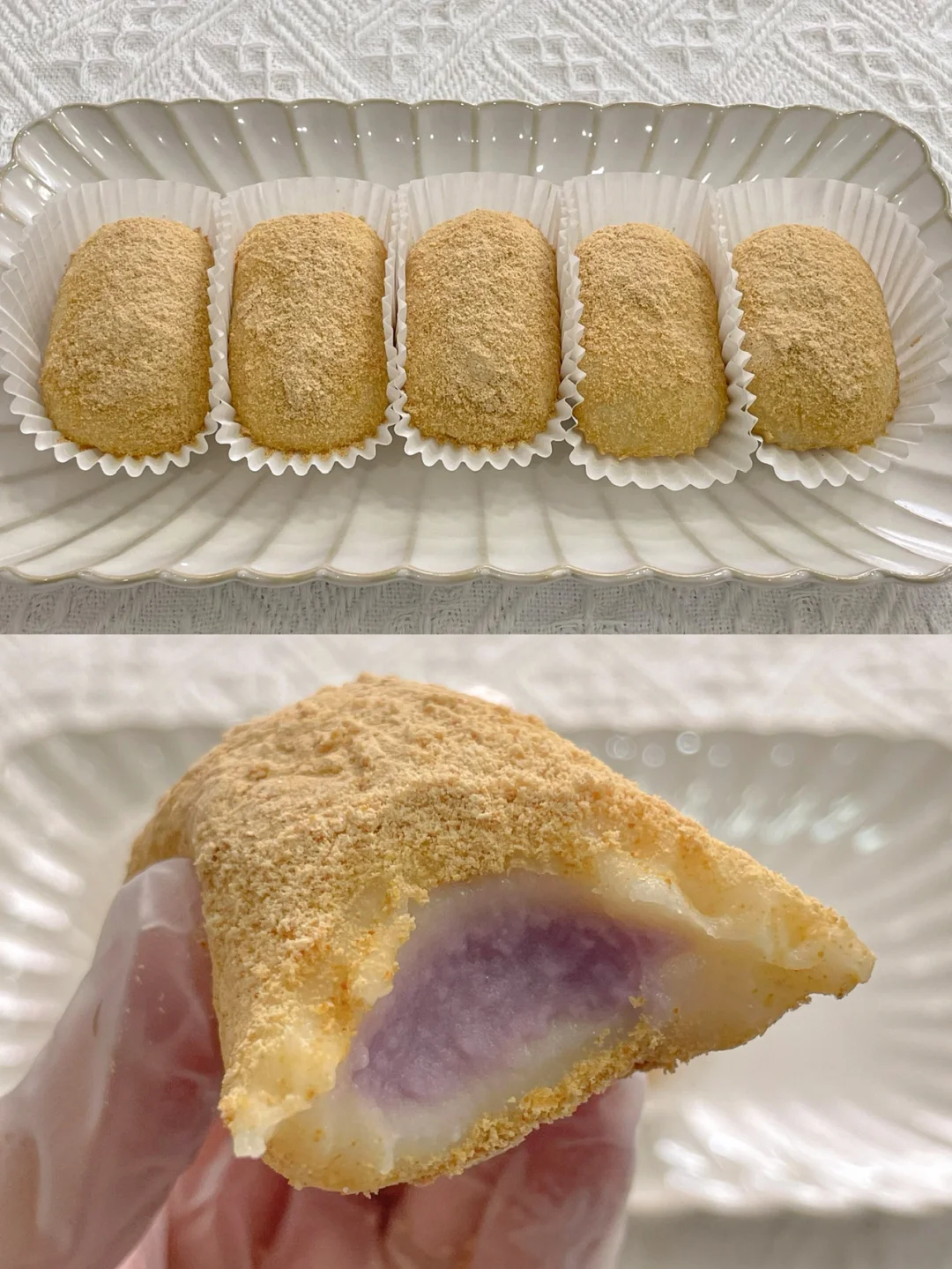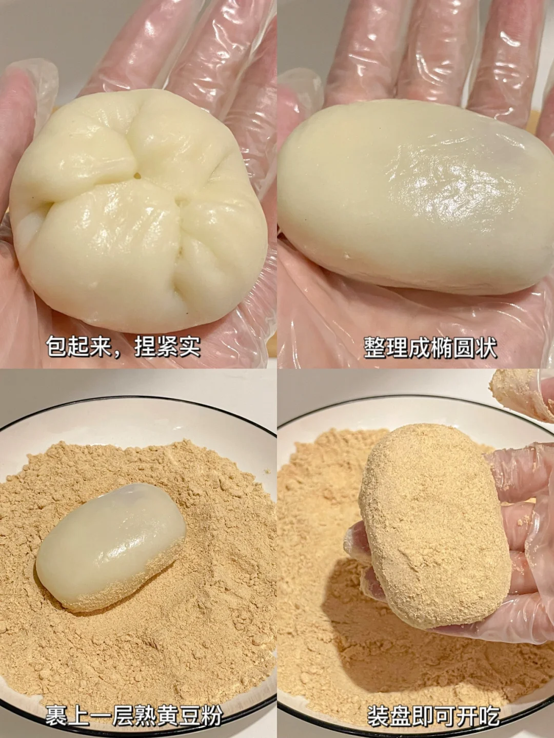 3⃣️将小团子按压成饼状,中间挤入芋泥,包起来,整理成椭圆状,裹上一层熟黄豆粉即可。